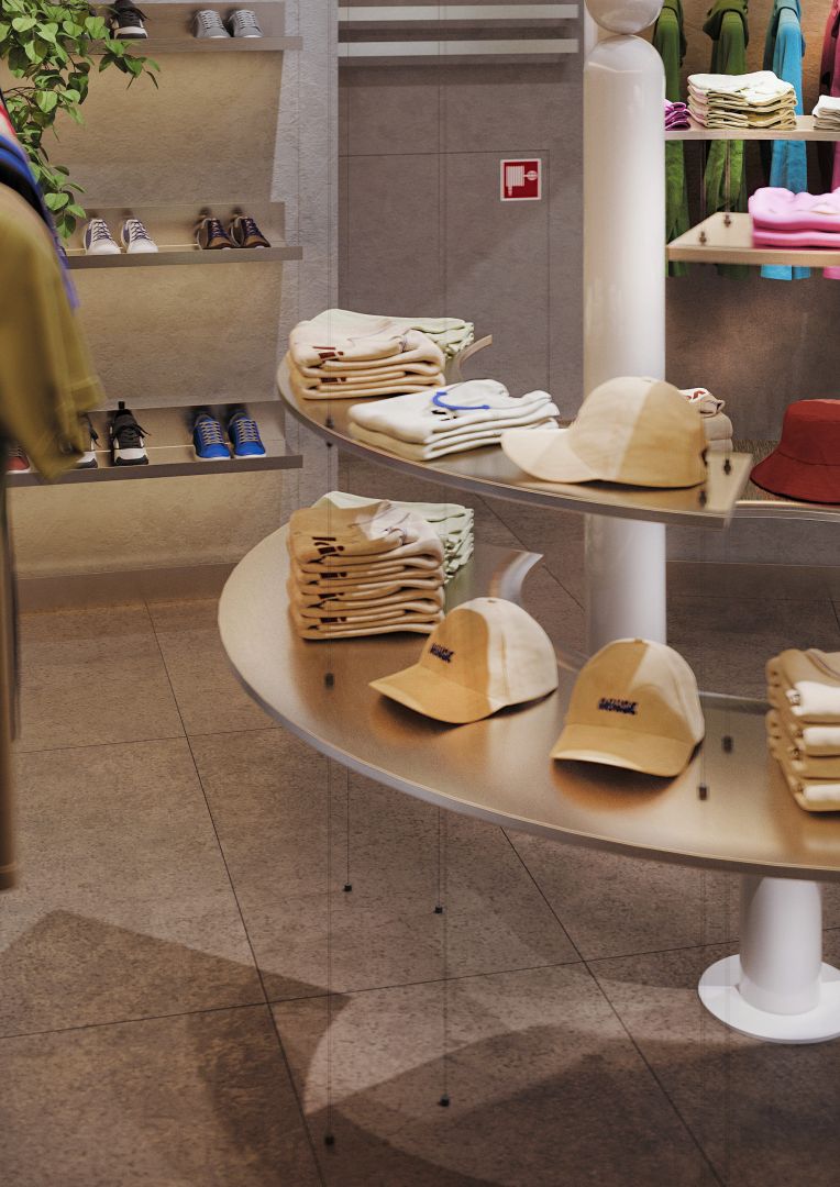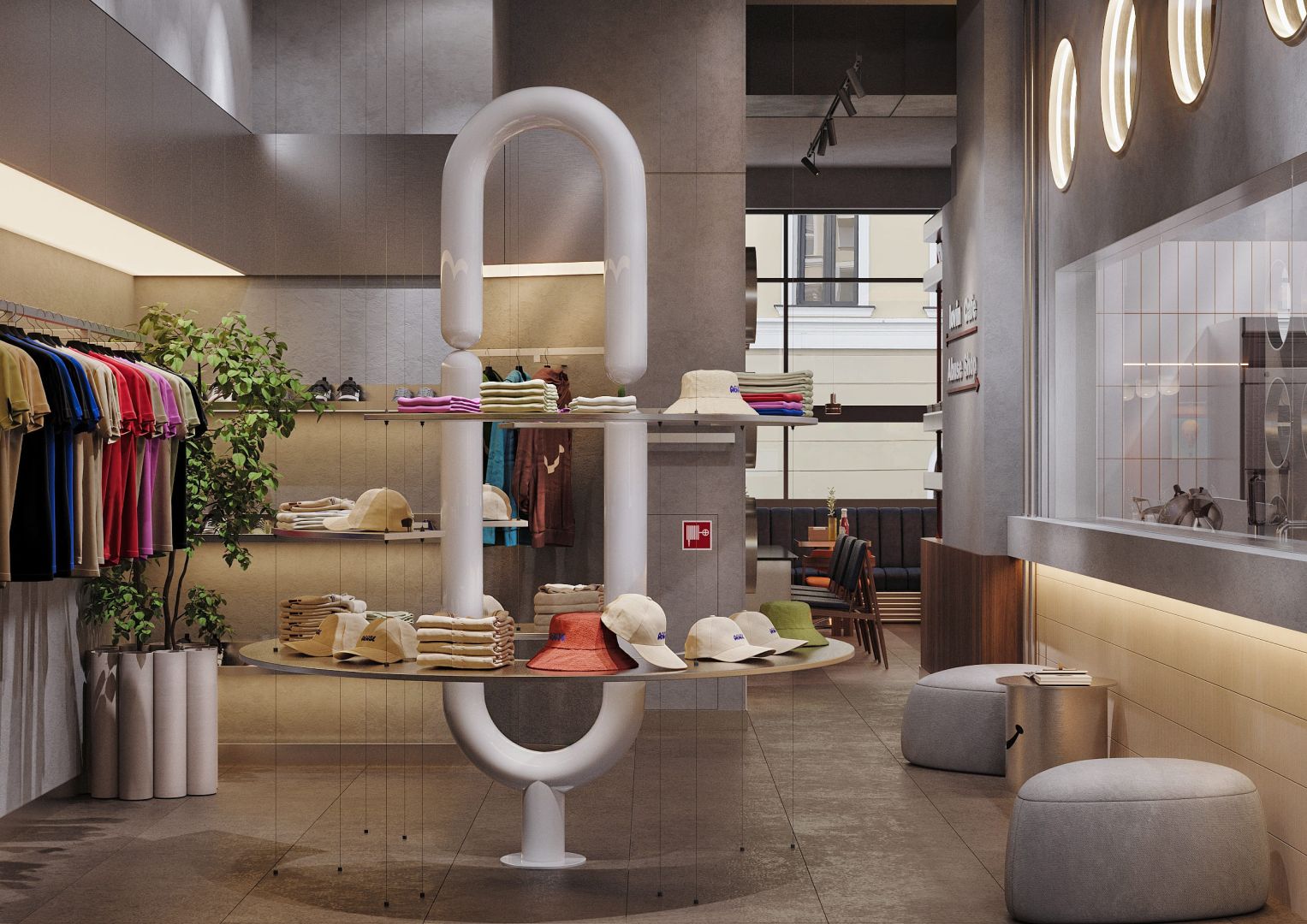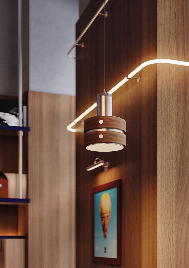 Акценты — постеры с фирменной графикой, аккуратные полки с винилом и мерчем, лаконичные светильники в индустриальном стиле. Всё работает на атмосферу: современно, дружелюбно, без лишнего шума.