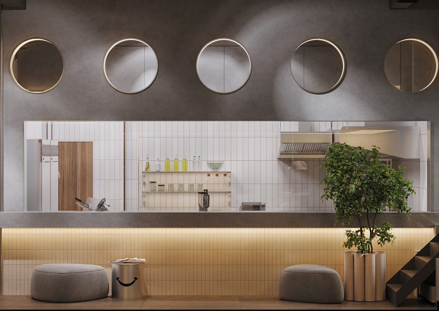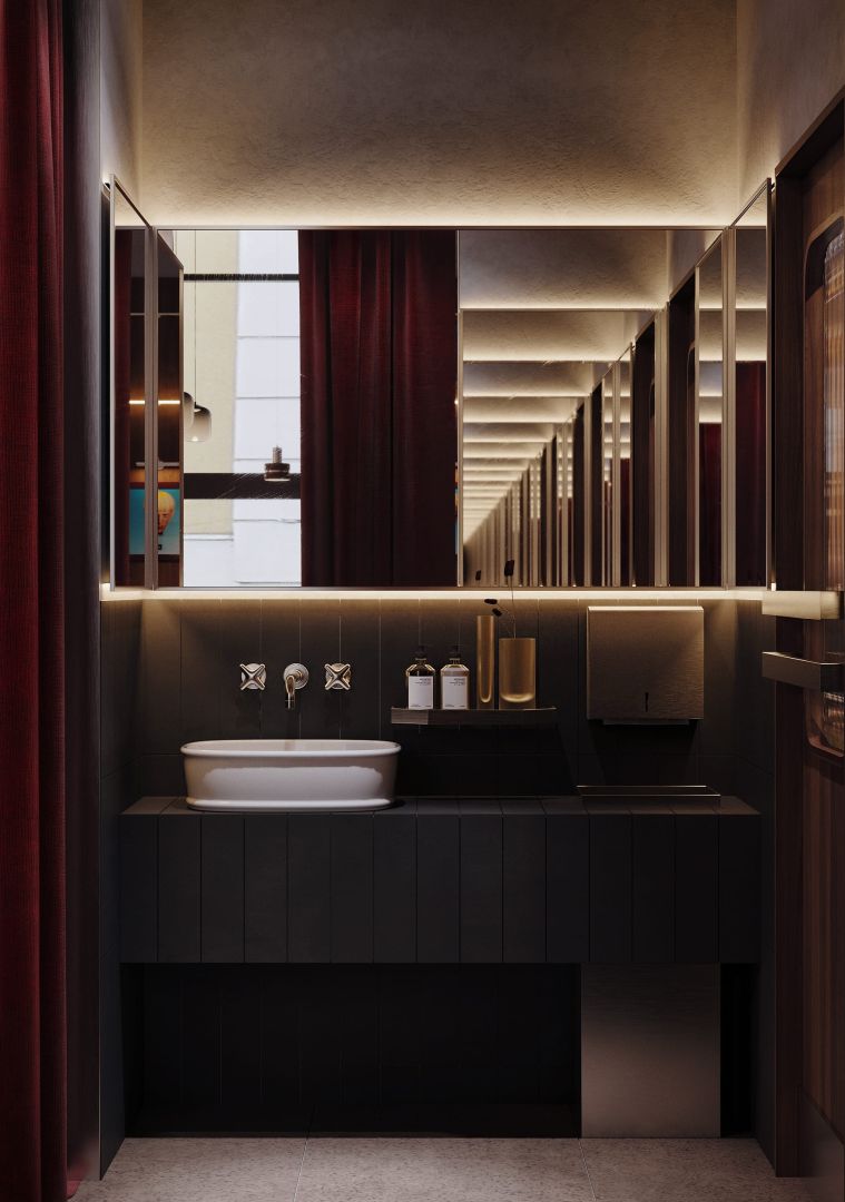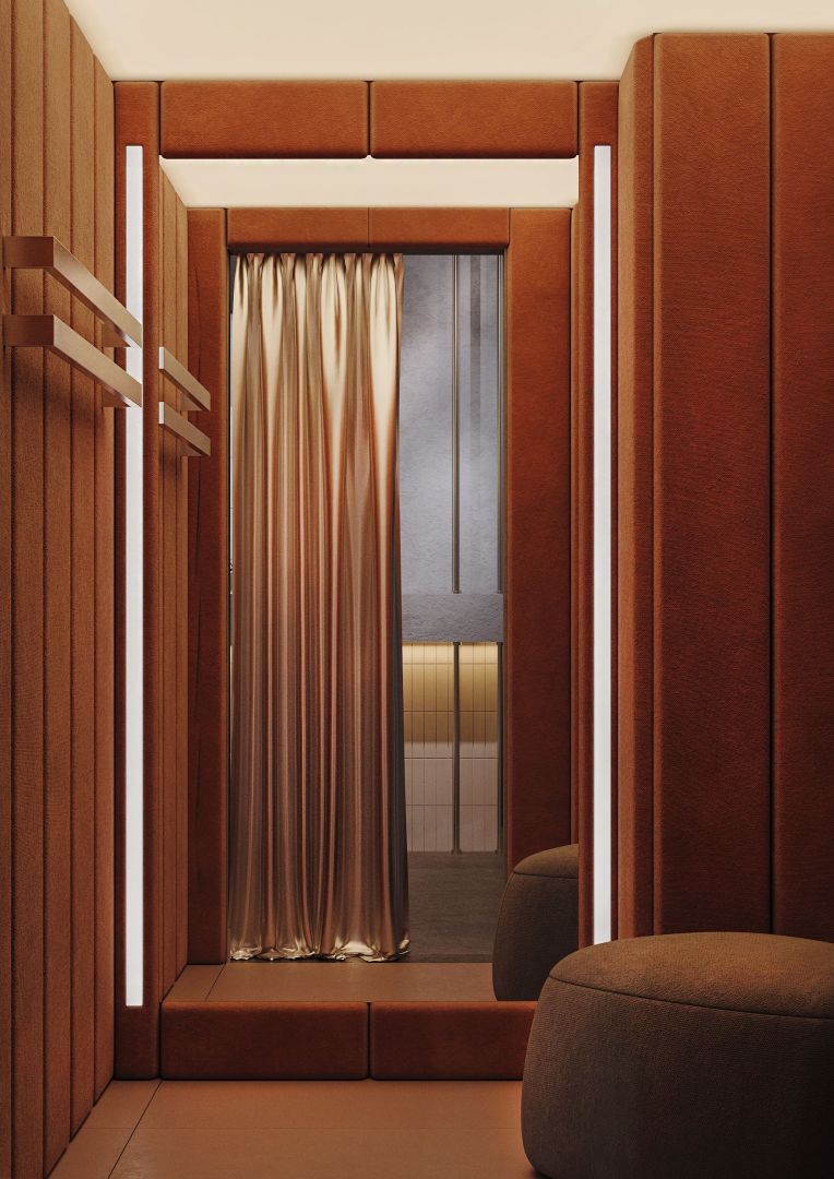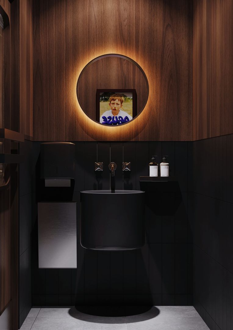 Тёплый минимализм, где комфорт встречается с графичной айдентикой. Интерьер построен на балансе натурального дерева, мягких терракотовых и шоколадных оттенков, матового металла и рассеянного света. Модульные диваны создают камерные посадки, а открытая линия кухни подчёркивает честность формата и ритм пространства.