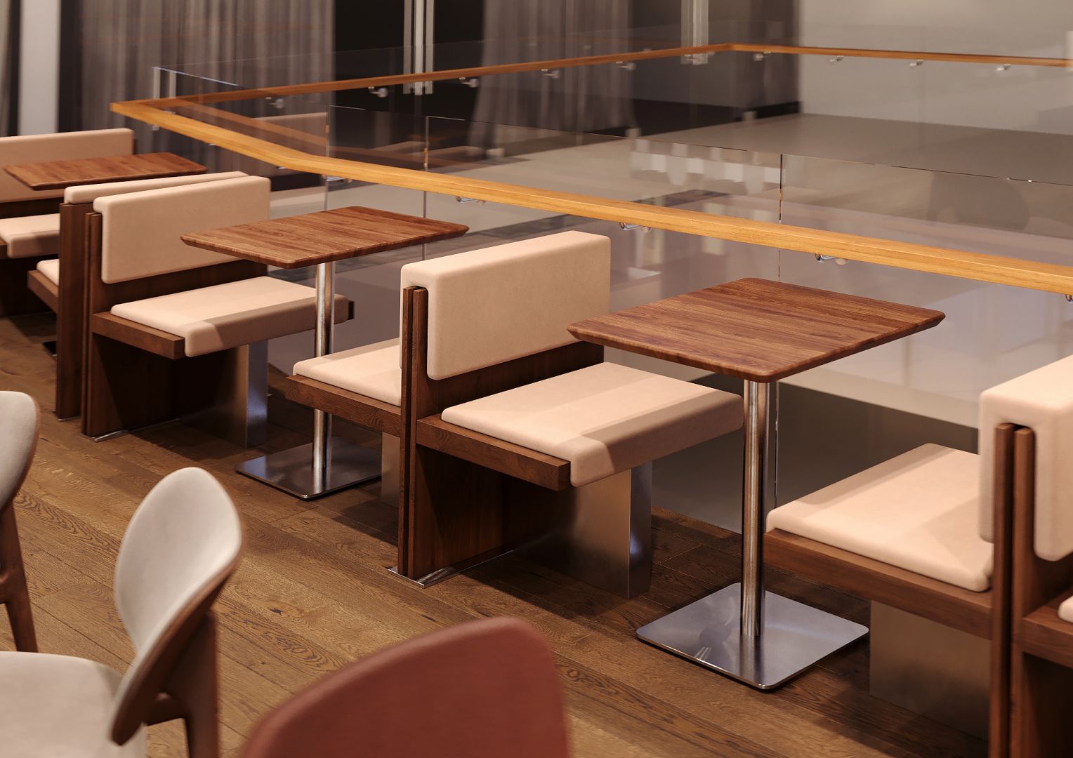 Кофейня «HERE N NOW» в ТЦ Смоленский пассаж, нам важно было создать образ сдержанной и даже немного строгой кофейни. Торговый центр всегда задает много ограничений, особенно когда ты становишься в центре зала, нам было запрещено возводить конструкции, крепиться в потолок, пол и т тд.