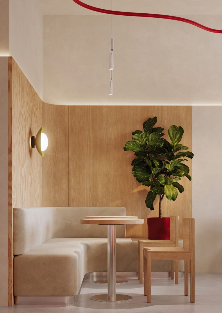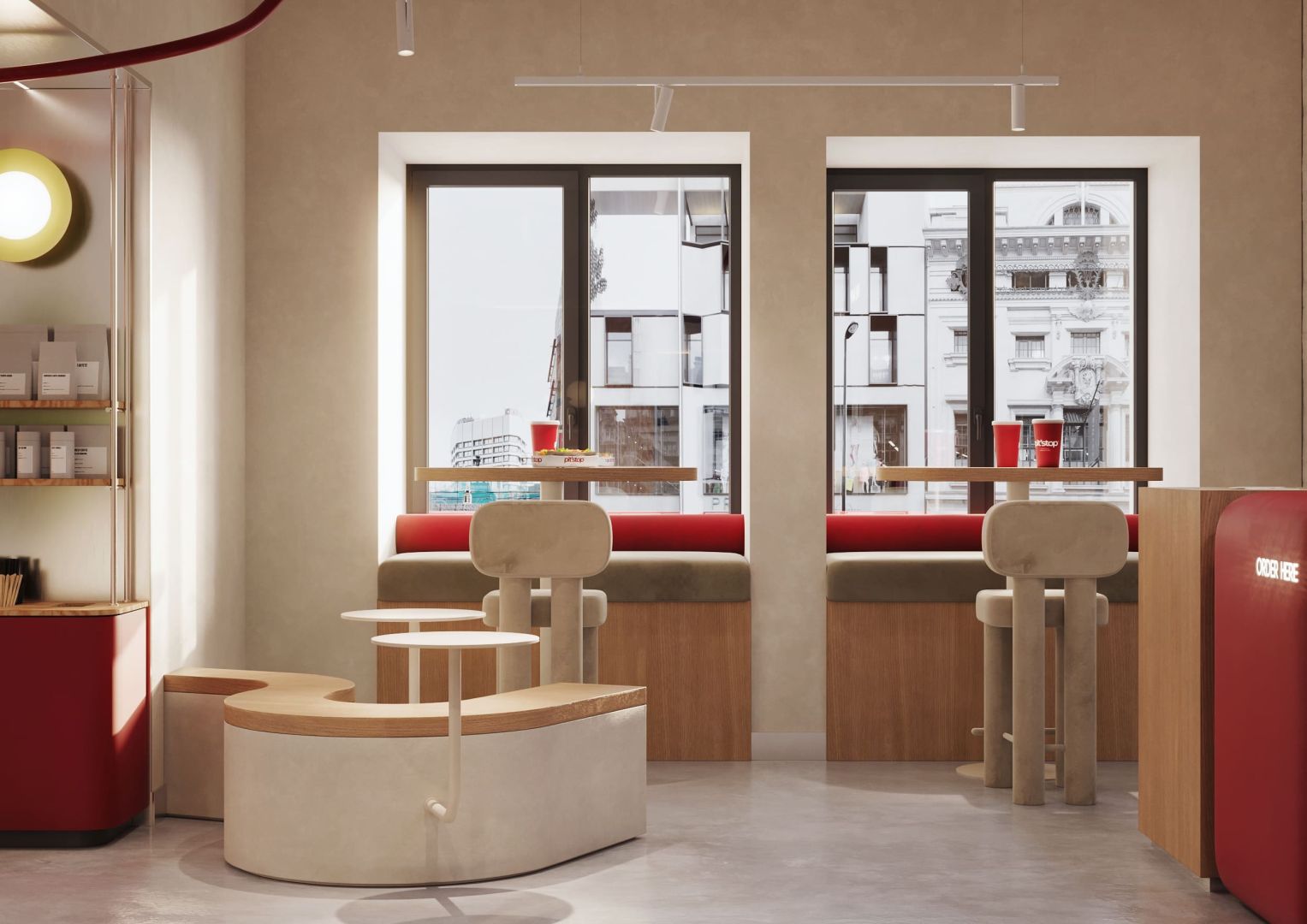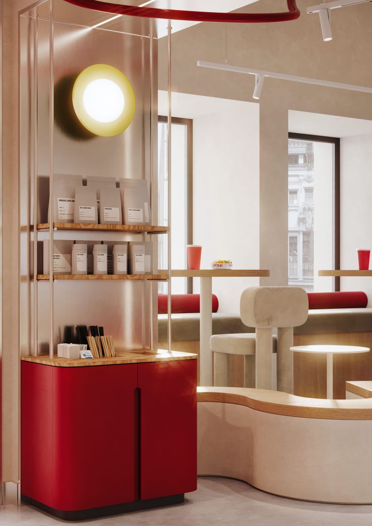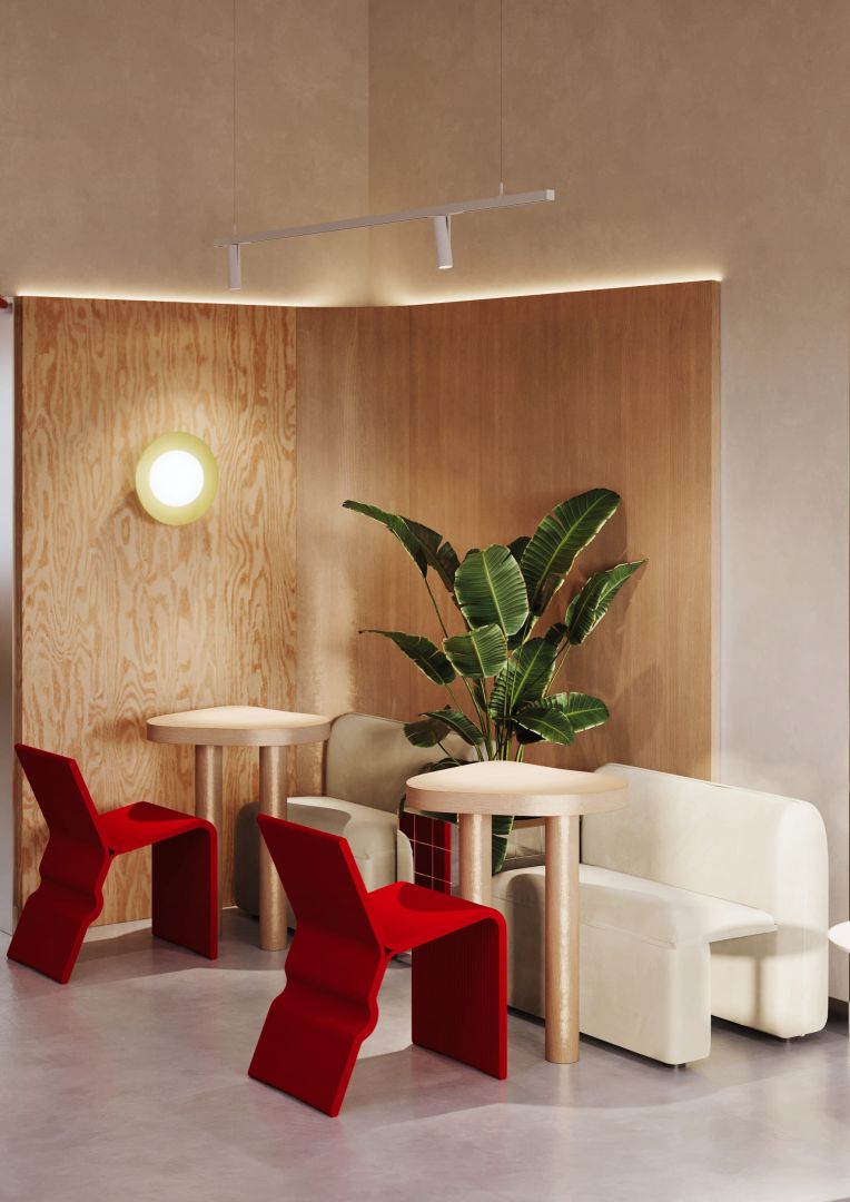 Прямые линии здесь сочетаются с плавными линиями столов и посадочных мест, а бежевый цвет дополняют яркие красные акценты.
