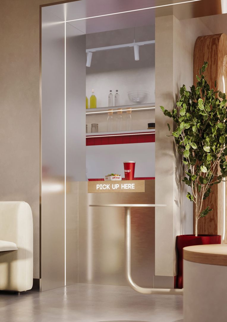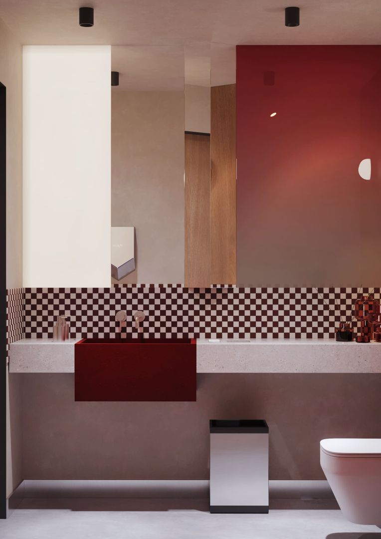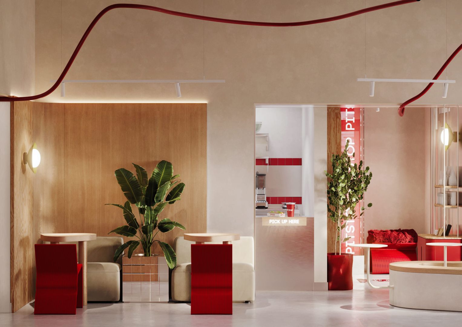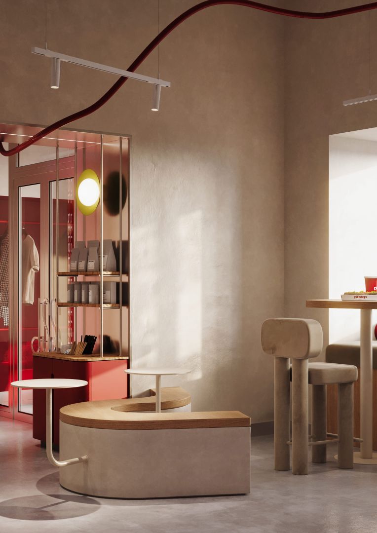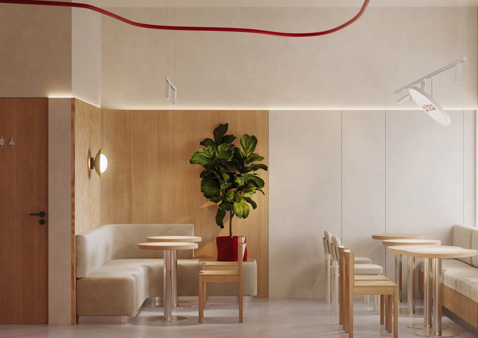 Прямые линии здесь сочетаются с плавными линиями столов и посадочных мест, а бежевый цвет дополняют яркие красные акценты.