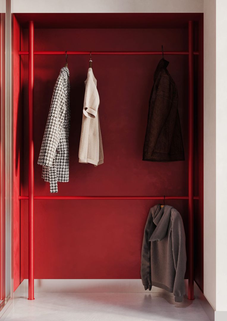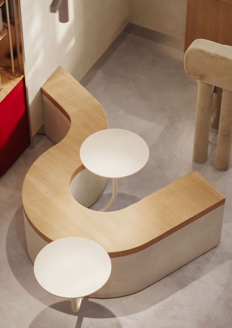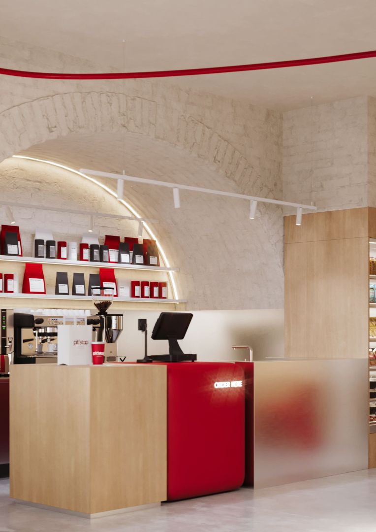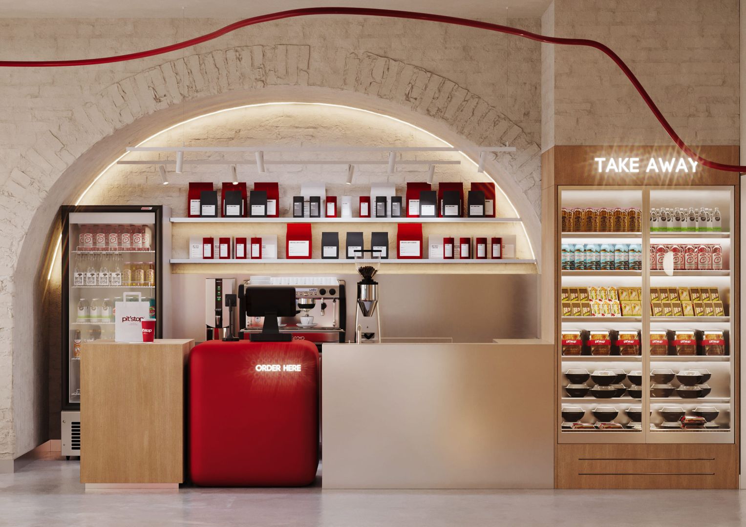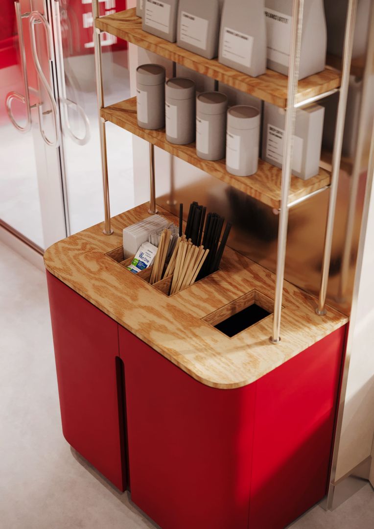 Соблюли тренд времени и собрали раздельную барную стойку сразу из трех оттенков и материалов: нержавеющая сталь, ярко красная эмаль в зоне кассы и шпон в зоне выдачи — как отражение всего наполнения проекта.