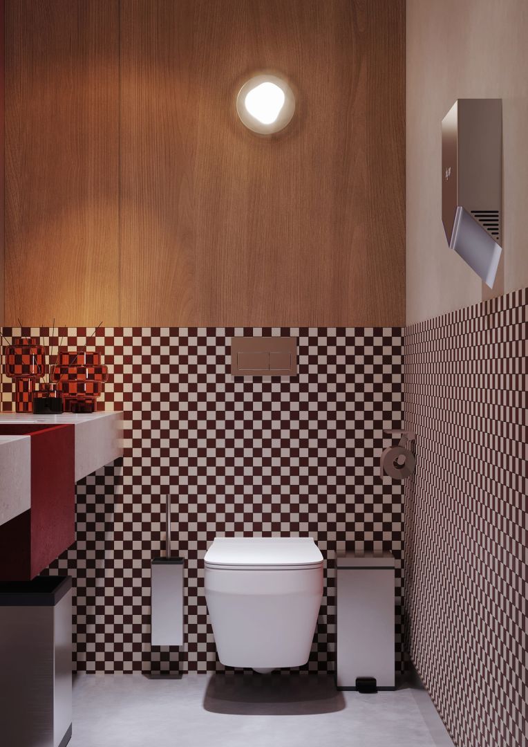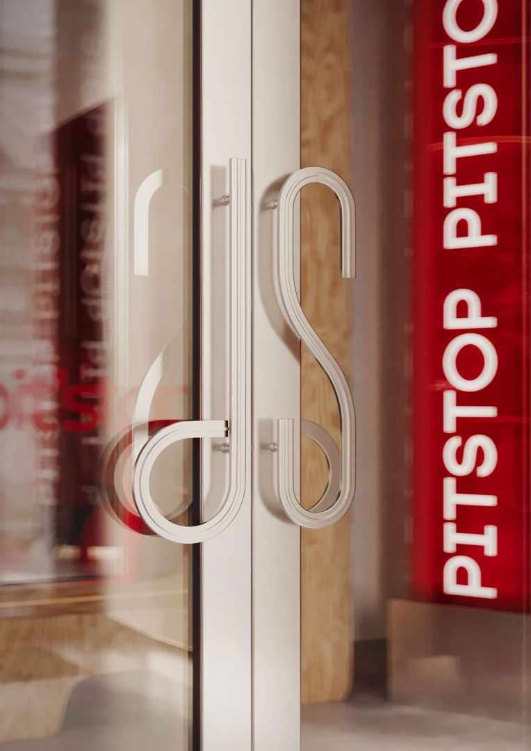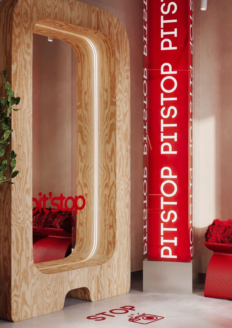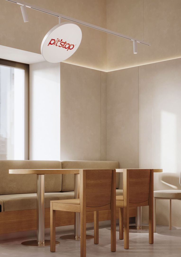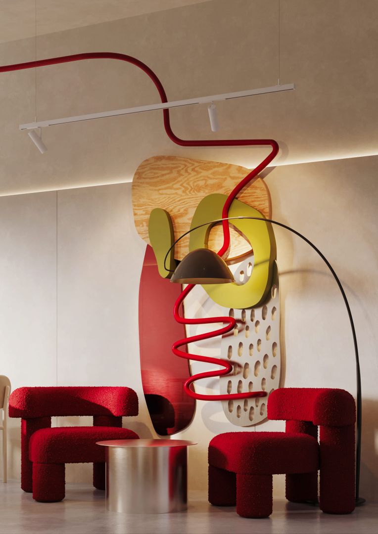 Яркой идеей заведения стала красная линия, проходящая по всему периметру потолка и завязывающая все пространство между собой. Этим символом мы передали аналогию с кетчупом, ведь красная линия как раз завершается в панно, при долгом рассмотрении которого, точно напомнит вам сендвич.