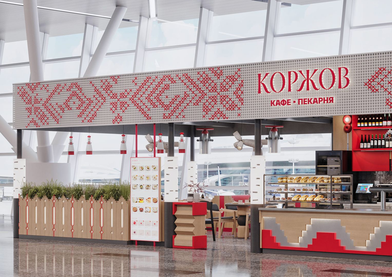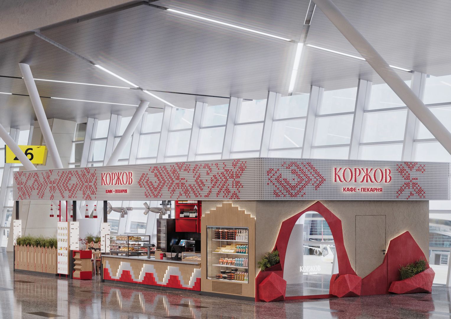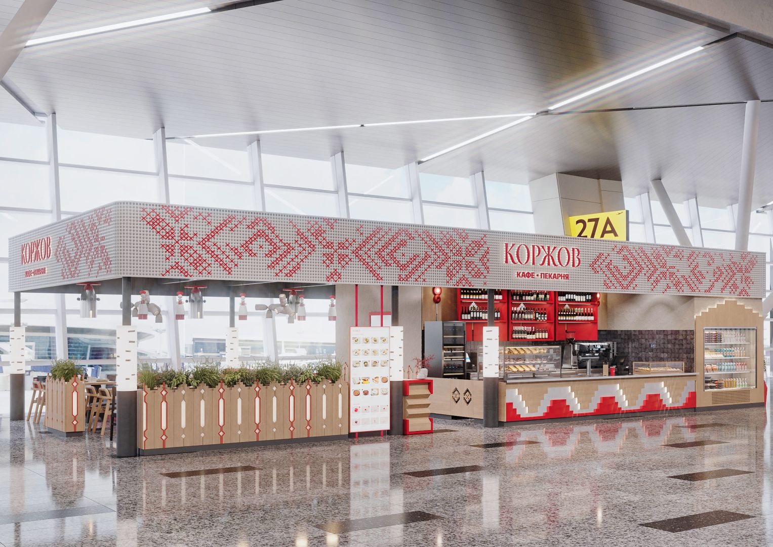 Это кафе-пекарня под названием «КОРЖОВ», расположенная в аэропорту Внуково, оформлена в современном и одновременно этническом стиле. Вот ключевые особенности этого заведения:
