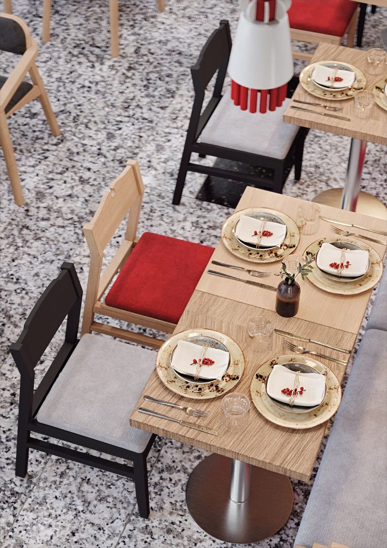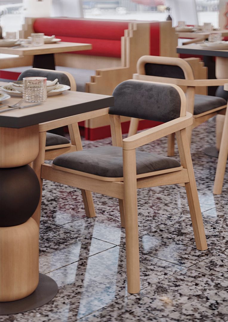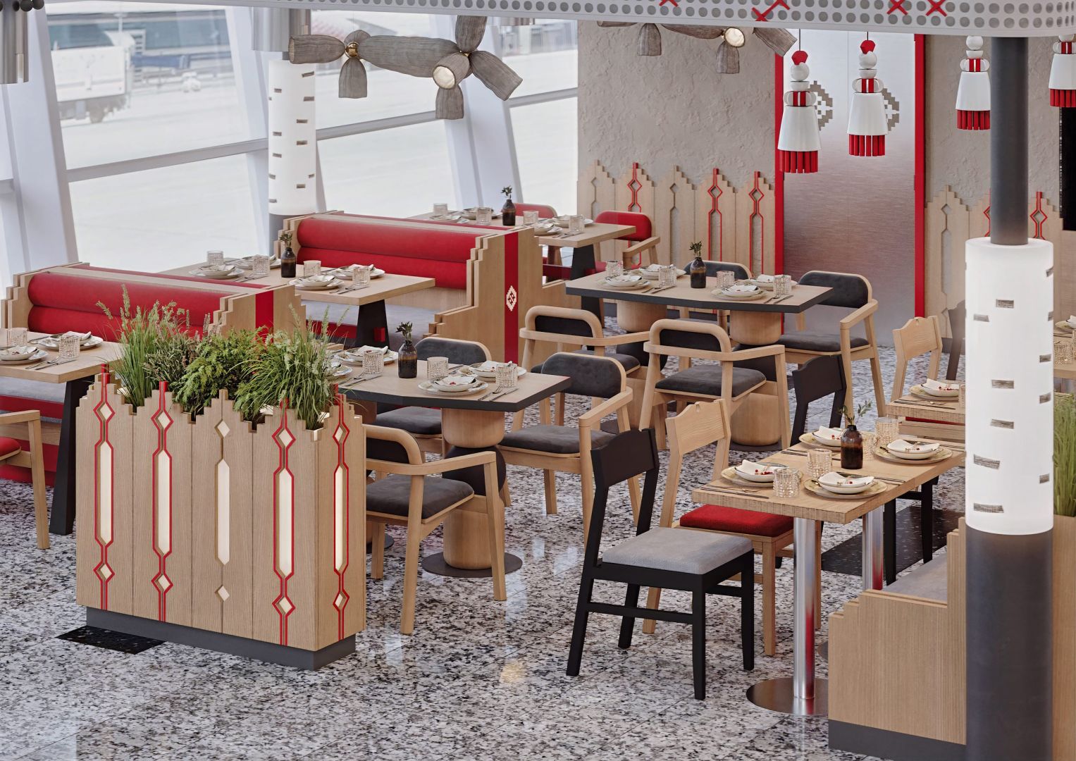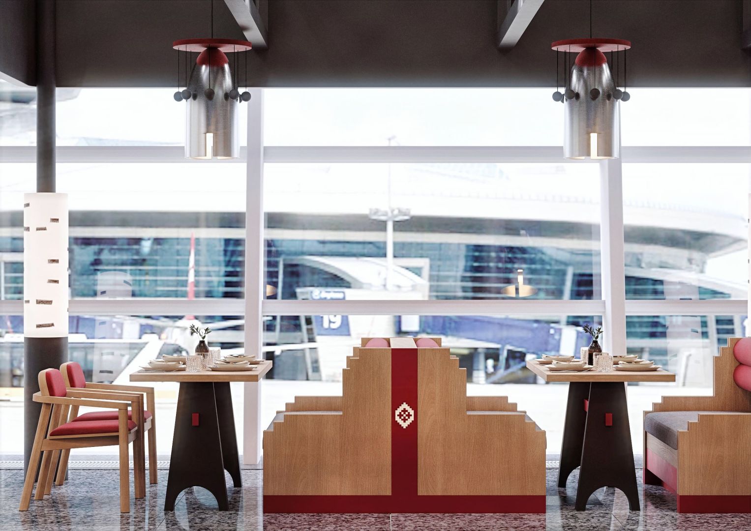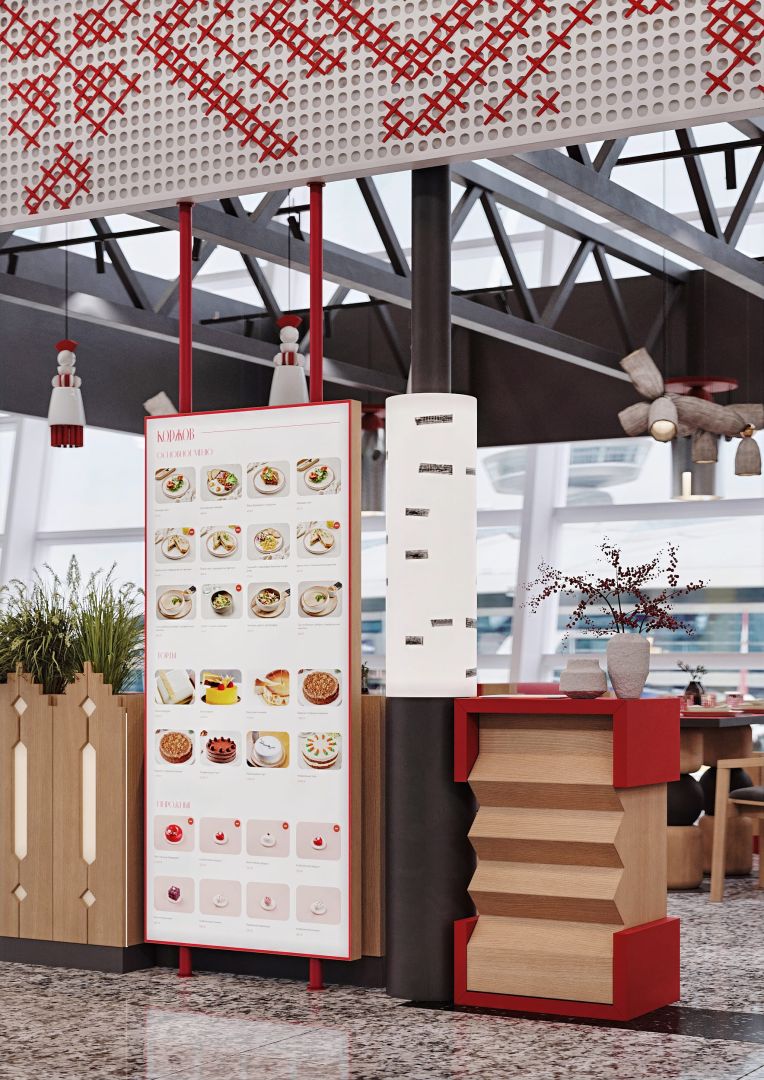 Цветовая палитра: Основные цвета — красный, белый, бежевый и серый, создают уютную, но запоминающуюся атмосферу, привлекающая к себе внимание пассажиров.