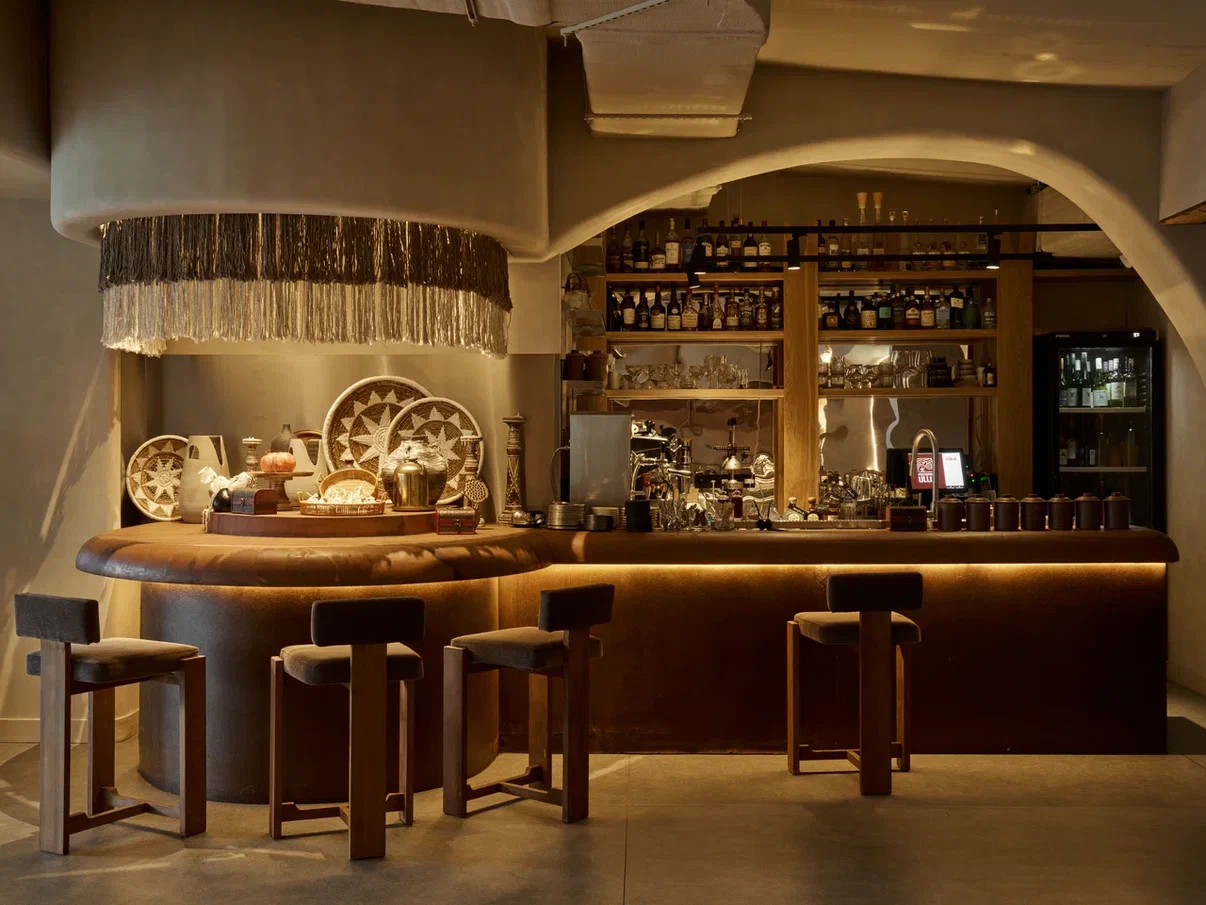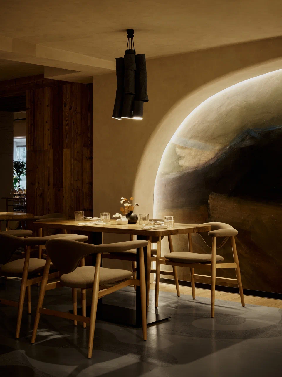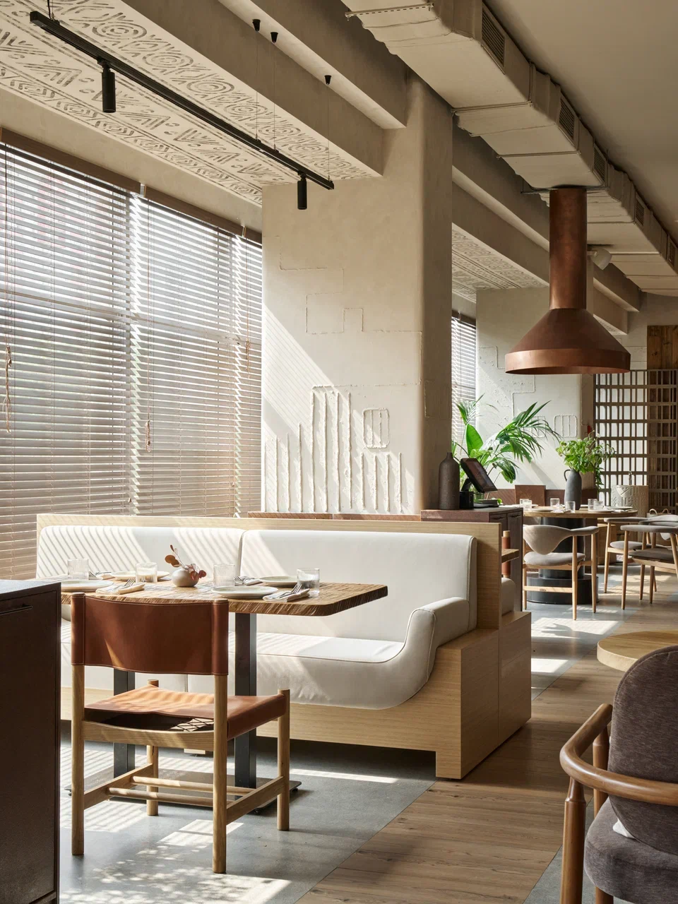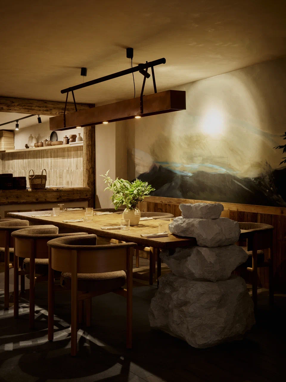 Пространство культурного погружения, наполненное уютом и традициями, где в каждой детали сочетаются эстетика, функциональность и тепло: от приглушённых оттенков, до мягкого света, преломляющегося о фактурное дерево, камень и ткани ручной работы. Текстильные элементы, вдохновлённые национальными мотивами, добавляют пространству душевности, а использование натуральных материалов — дерева, керамики, бетона — словно переносит гостей в аутентичный горный дом, где ощущается сердечное тепло и связь с природой. Интерьер живой и тактильный, пробуждающий чувства и создающим атмосферу полного расслабления.