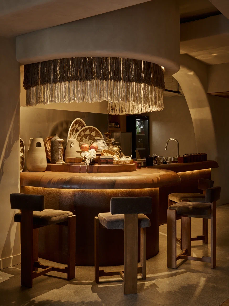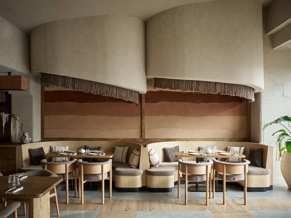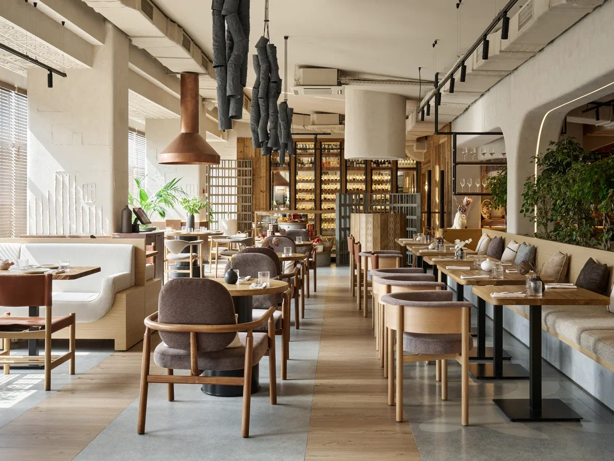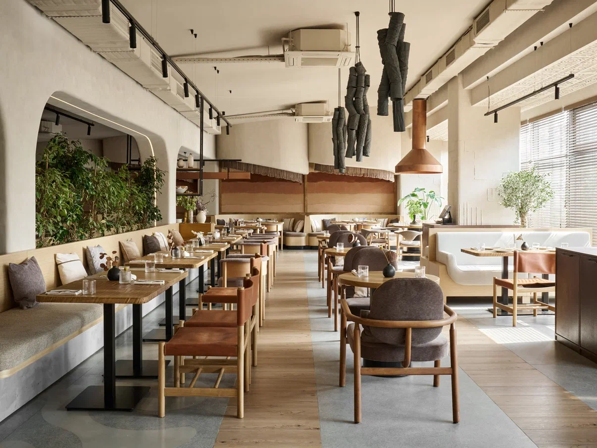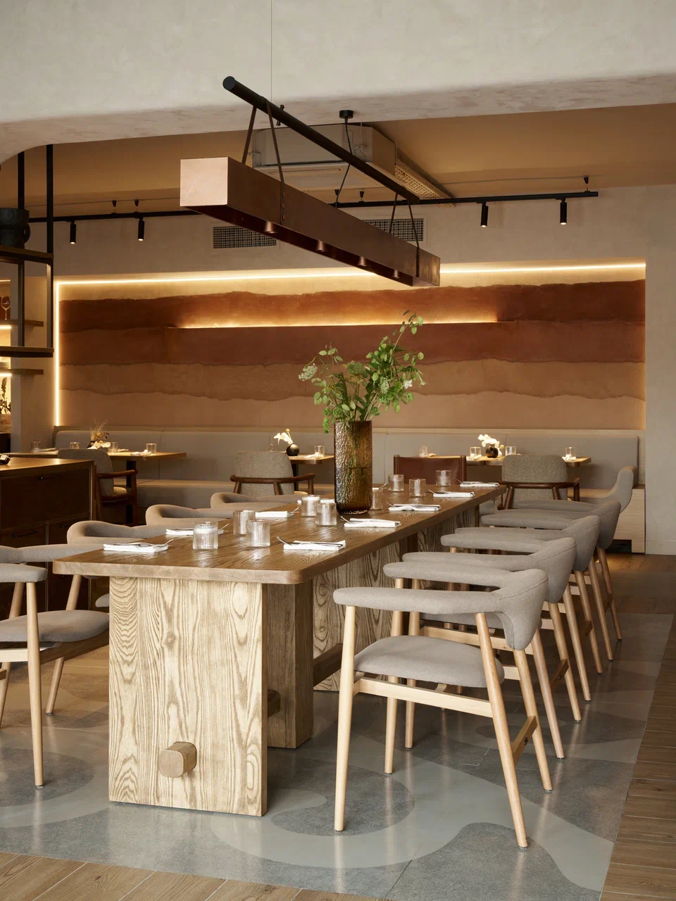 Пространство культурного погружения, наполненное уютом и традициями, где в каждой детали сочетаются эстетика, функциональность и тепло: от приглушённых оттенков, до мягкого света, преломляющегося о фактурное дерево, камень и ткани ручной работы. Текстильные элементы, вдохновлённые национальными мотивами, добавляют пространству душевности, а использование натуральных материалов — дерева, керамики, бетона — словно переносит гостей в аутентичный горный дом, где ощущается сердечное тепло и связь с природой. Интерьер живой и тактильный, пробуждающий чувства и создающим атмосферу полного расслабления.