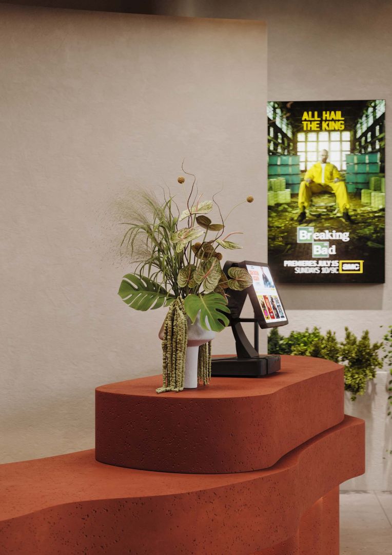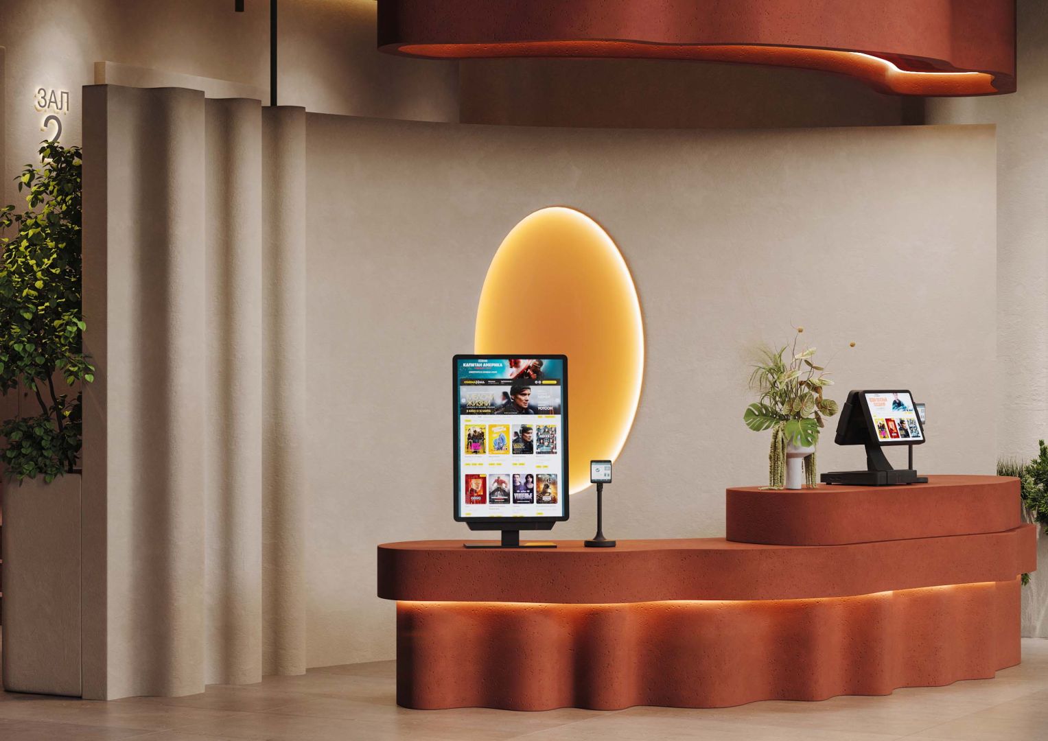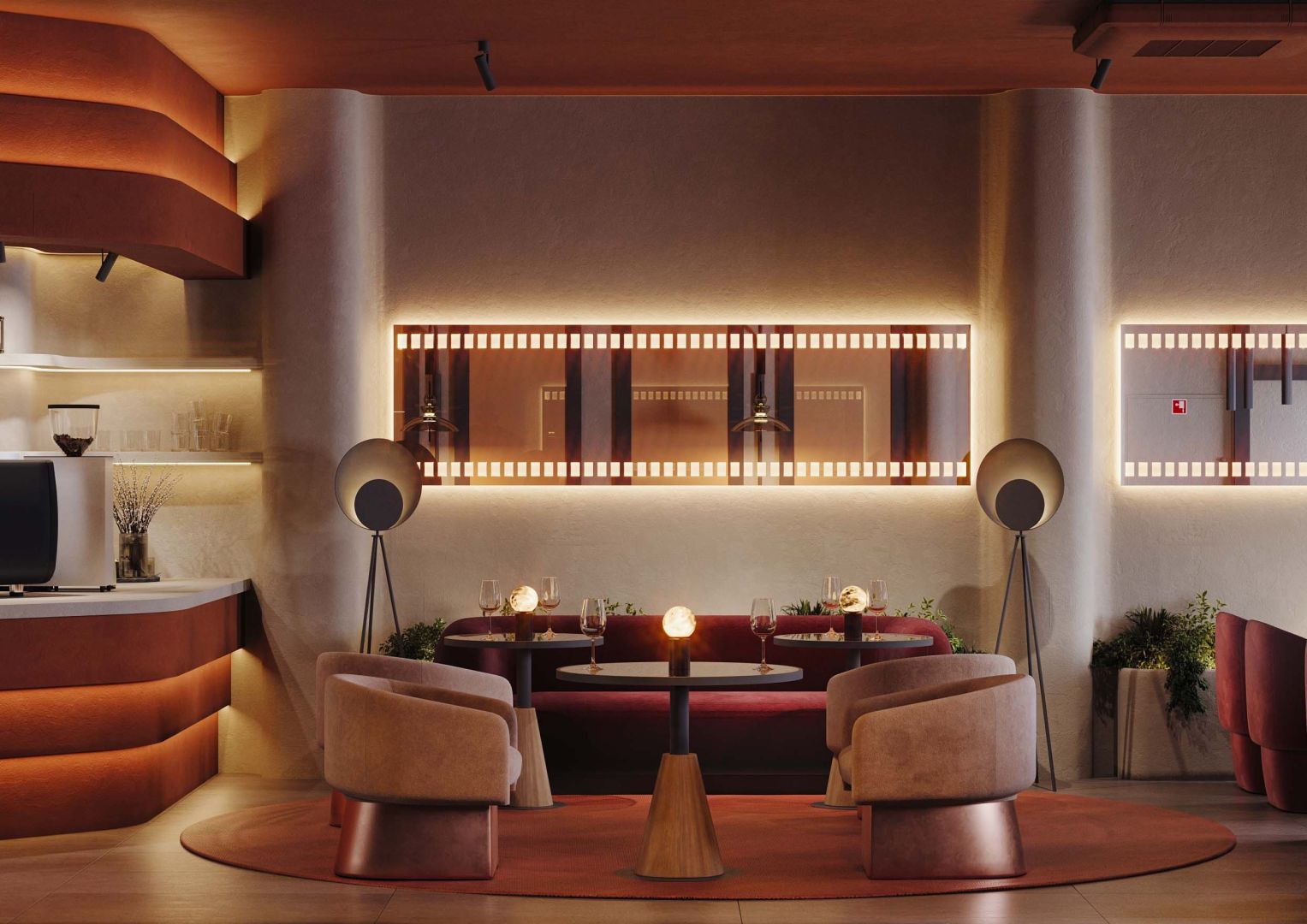 Изогнутая стойка ресепшн встречает гостей кинотеатра, мягкие линии напоминают киноплёнку. Металлические элементы и зеркала отсылают к студийным софитам и гримёрным Голливуда. Цвета бордо и золота создают ауру старых кинотеатров и дворцов кино.