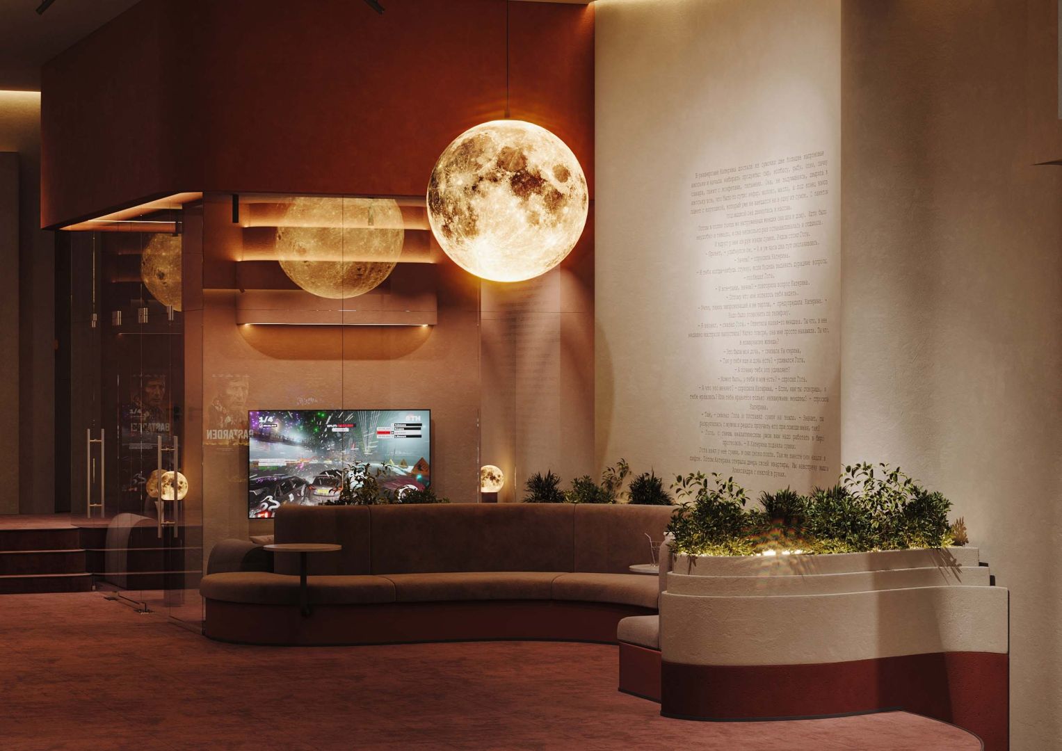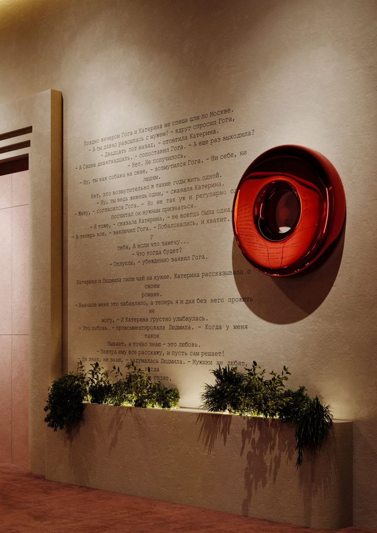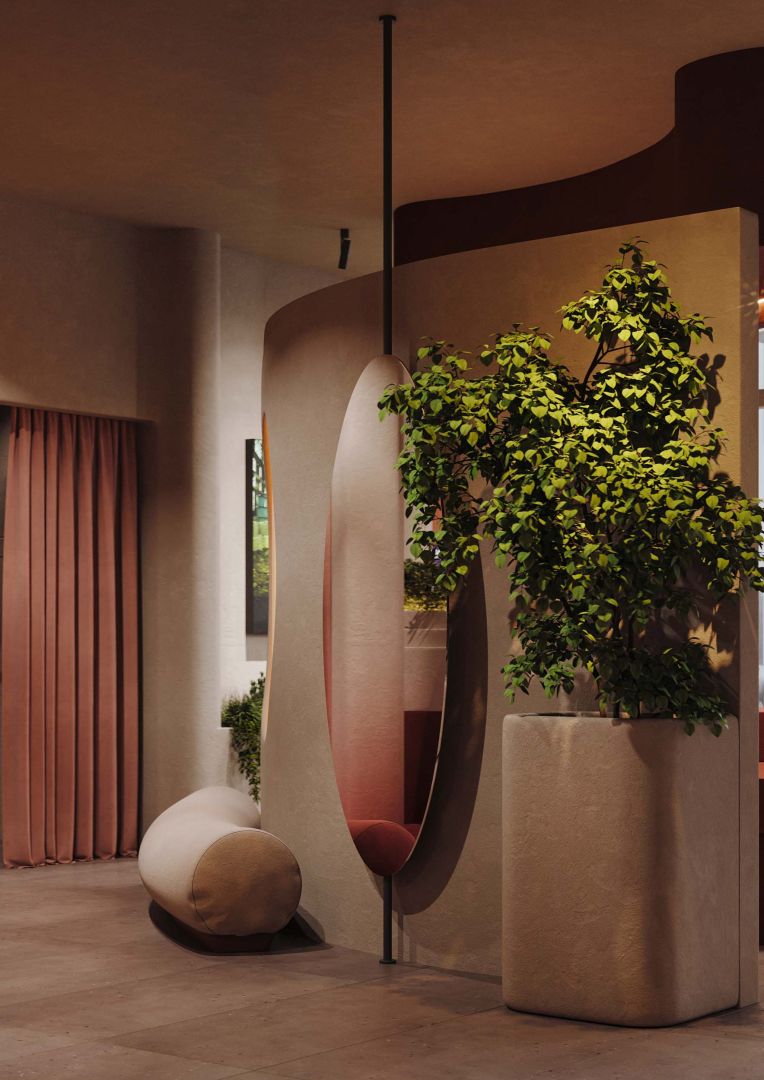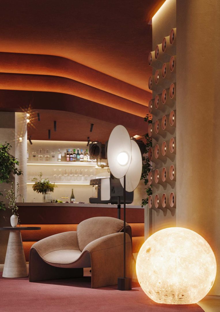 В зоне ожидания красный диван и подвесная луна-сфера превращают пространство в метафору грёзы.