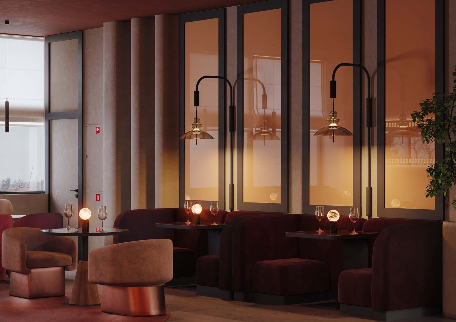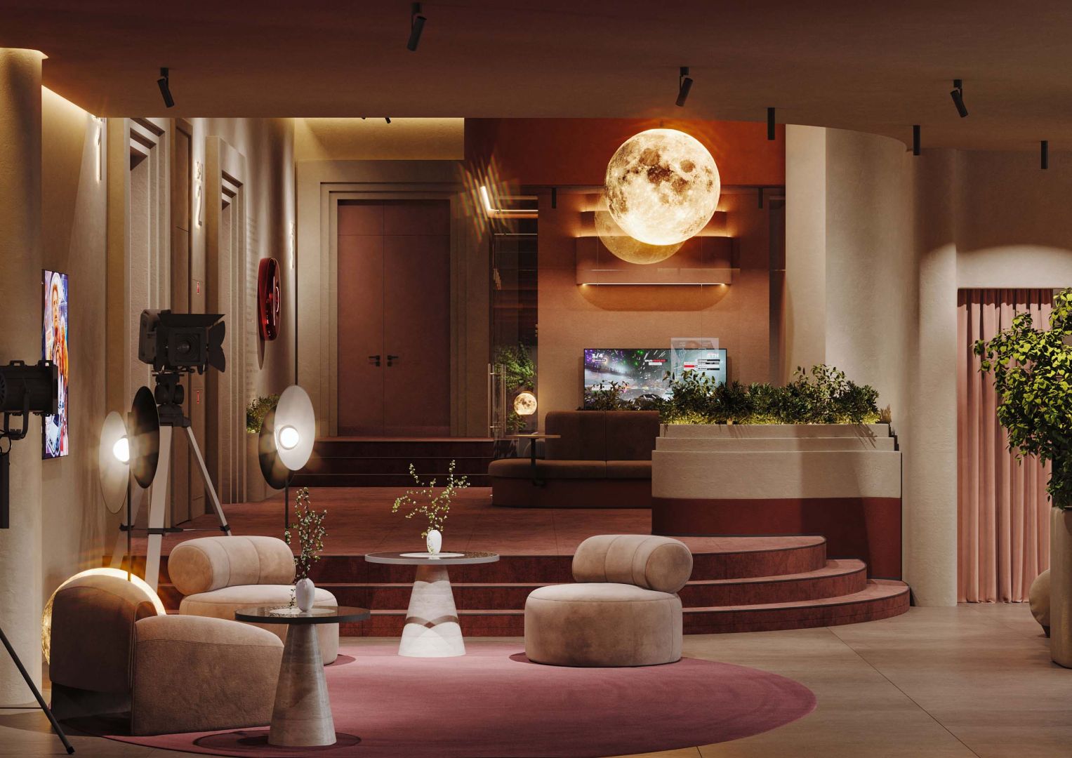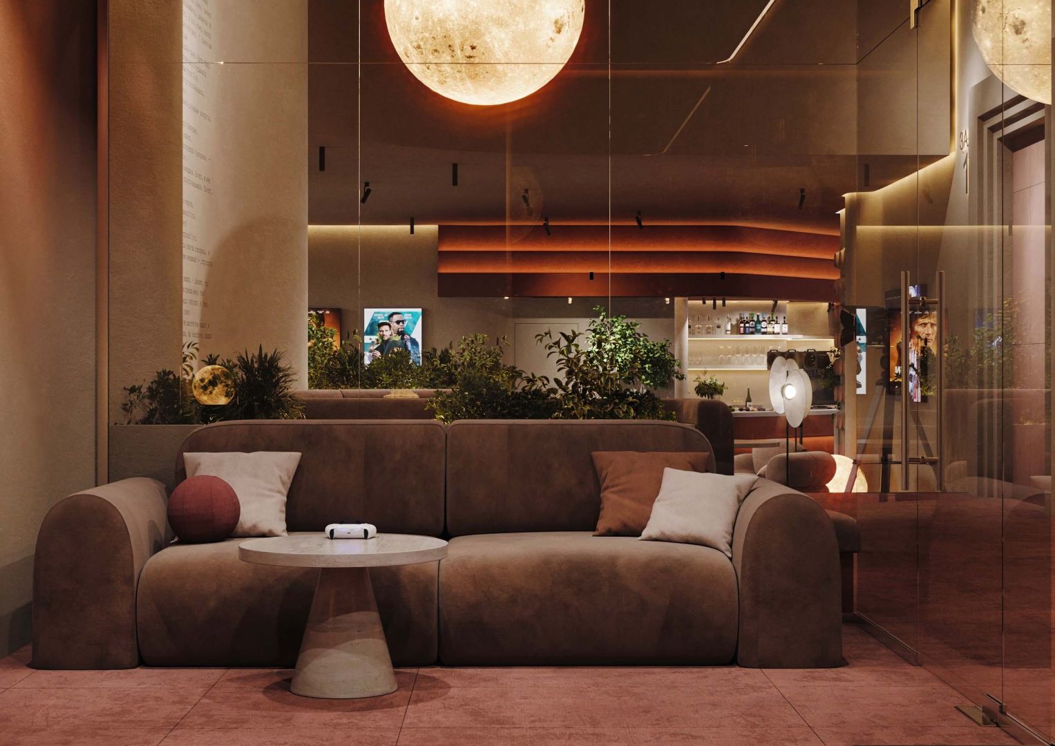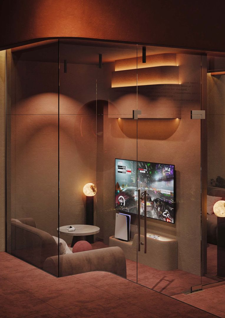 В зоне ожидания красный диван и подвесная луна-сфера превращают пространство в метафору грёзы.
