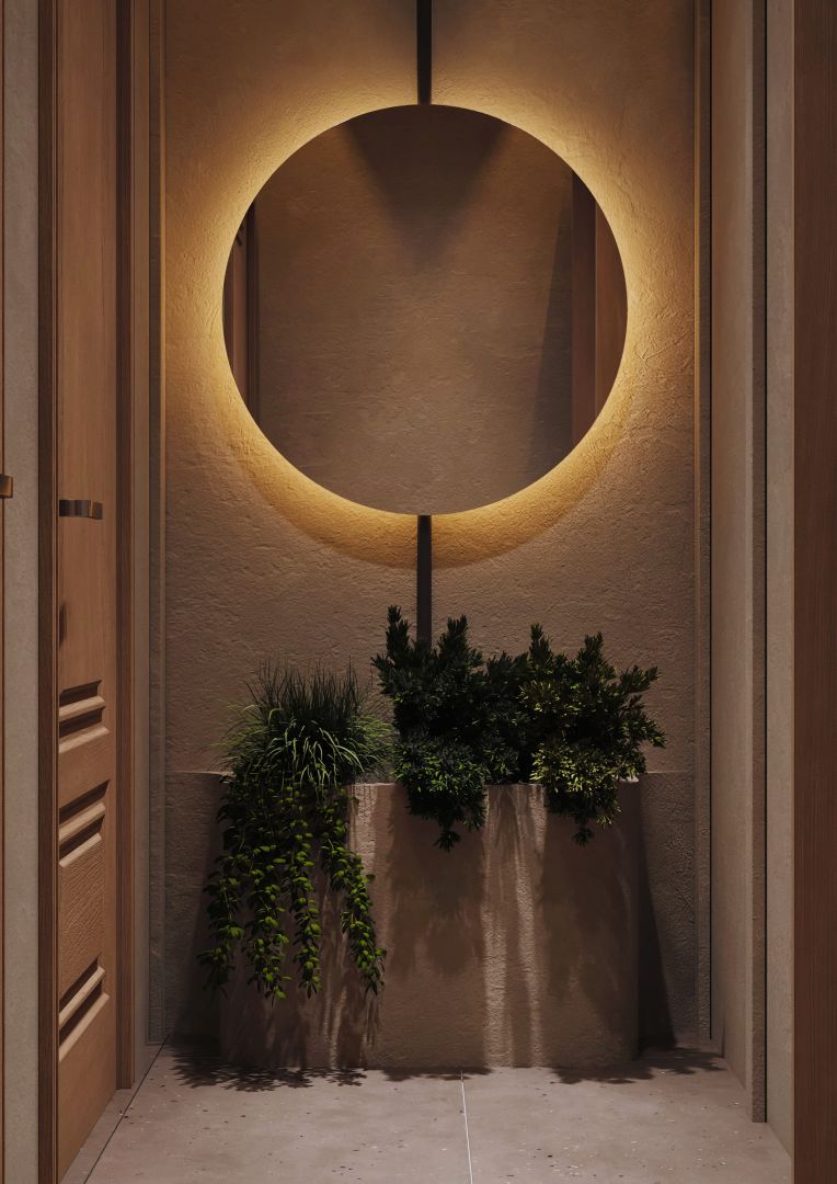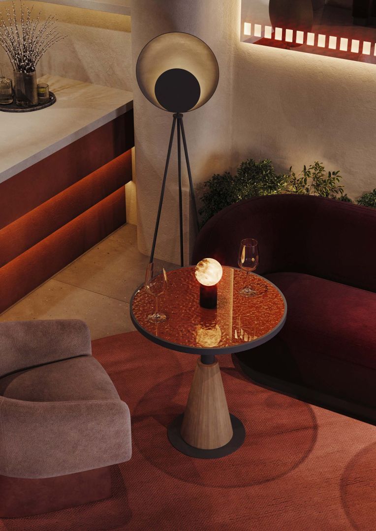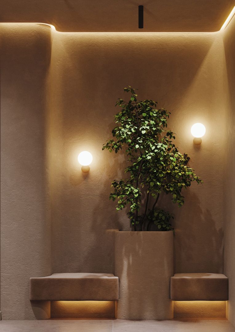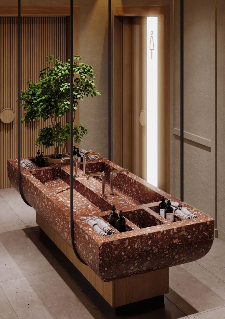 Зеркала с подсветкой, напоминающей киноплёнку — отсылка к закулисью и гримёрным. Светильники-триподы — словно съёмочные камеры, фиксирующие мгновения.