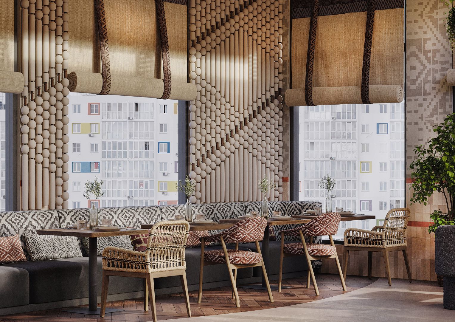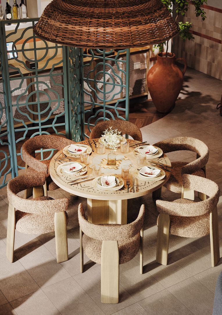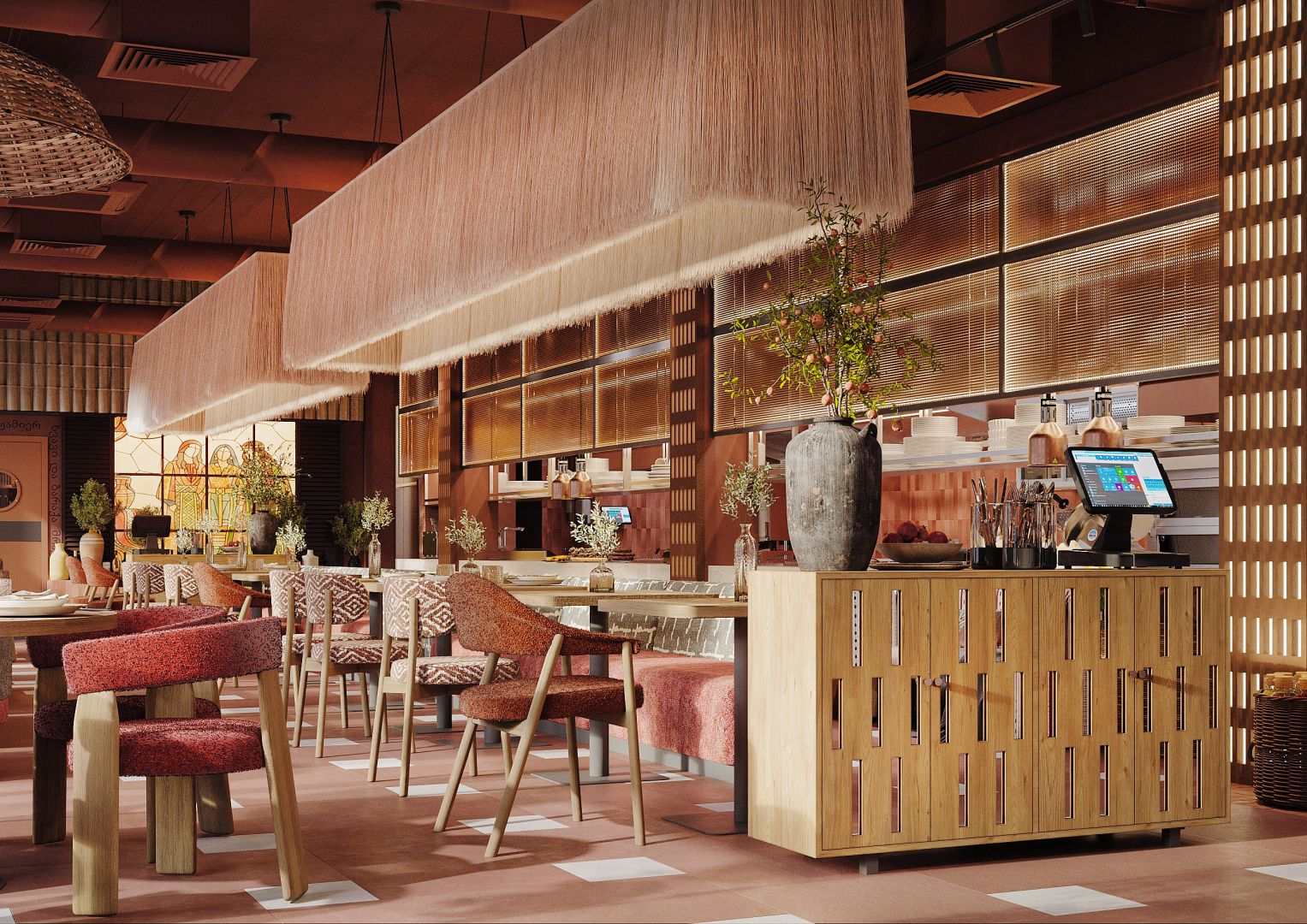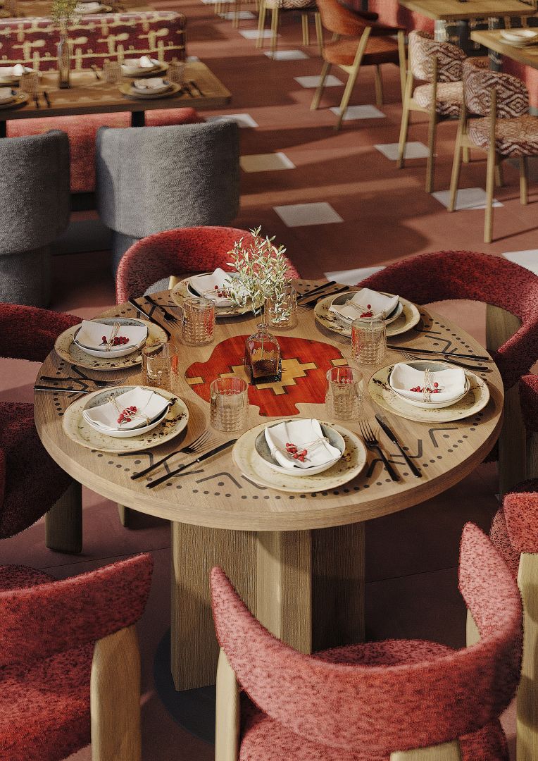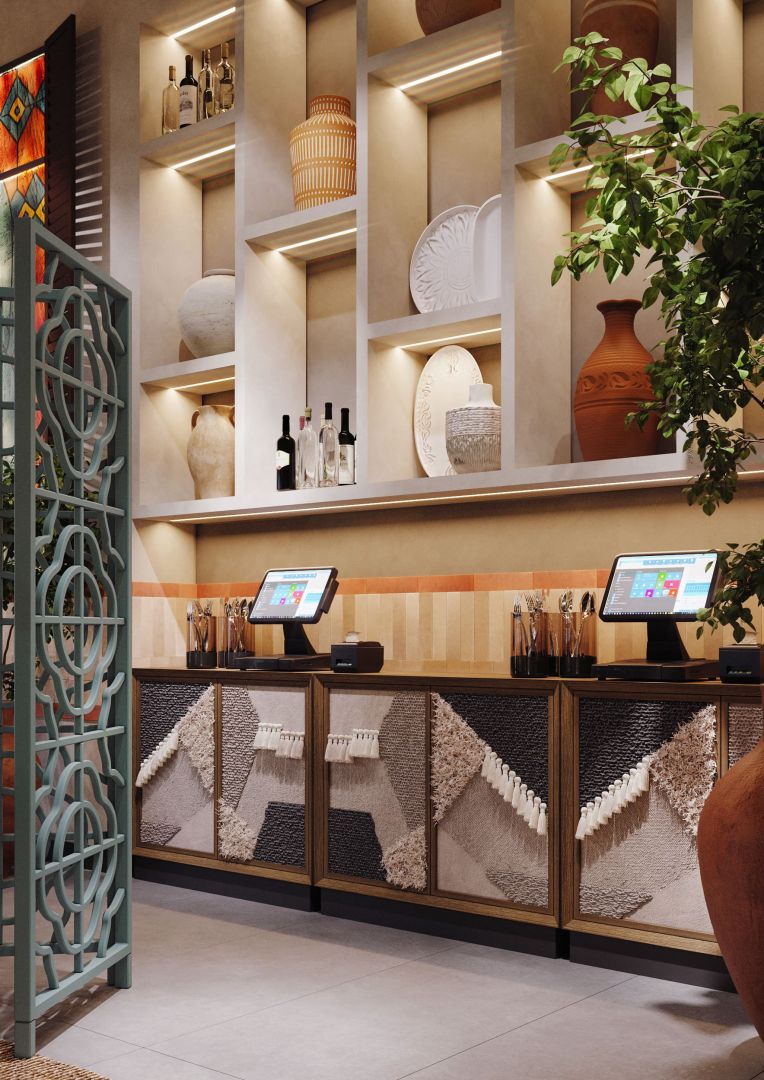 Мы использовали переработанные грузинские мотивы в виде орнаментальных элементах на стенах и мебели. Интересные принты на мягкой мебели, а так же необычные варианты отделок. Было разработано много индивидуальных предметов мебели, интересные стейшны с тканевыми вставками, геометрические формы, столы, декоративные перегородки.
