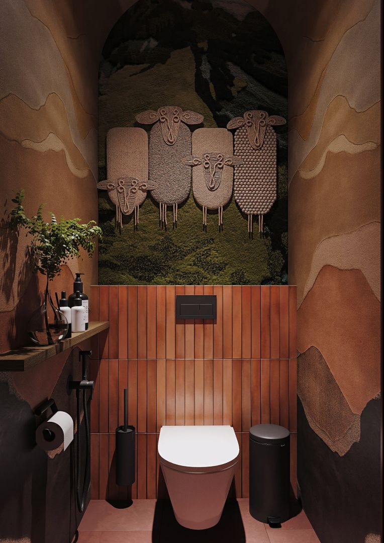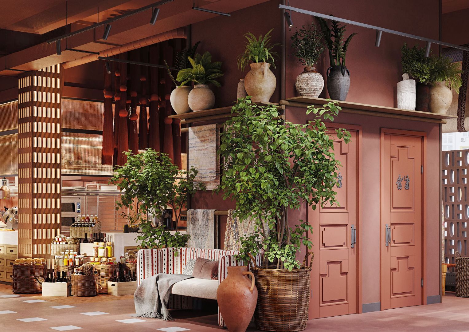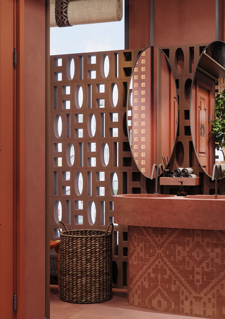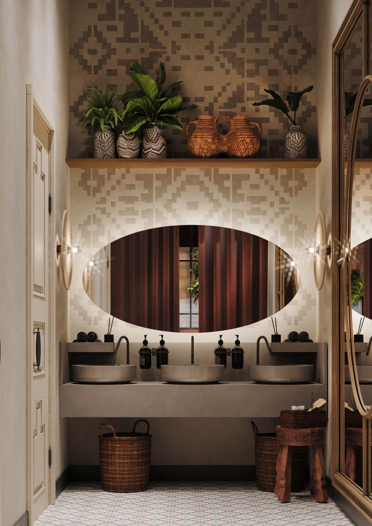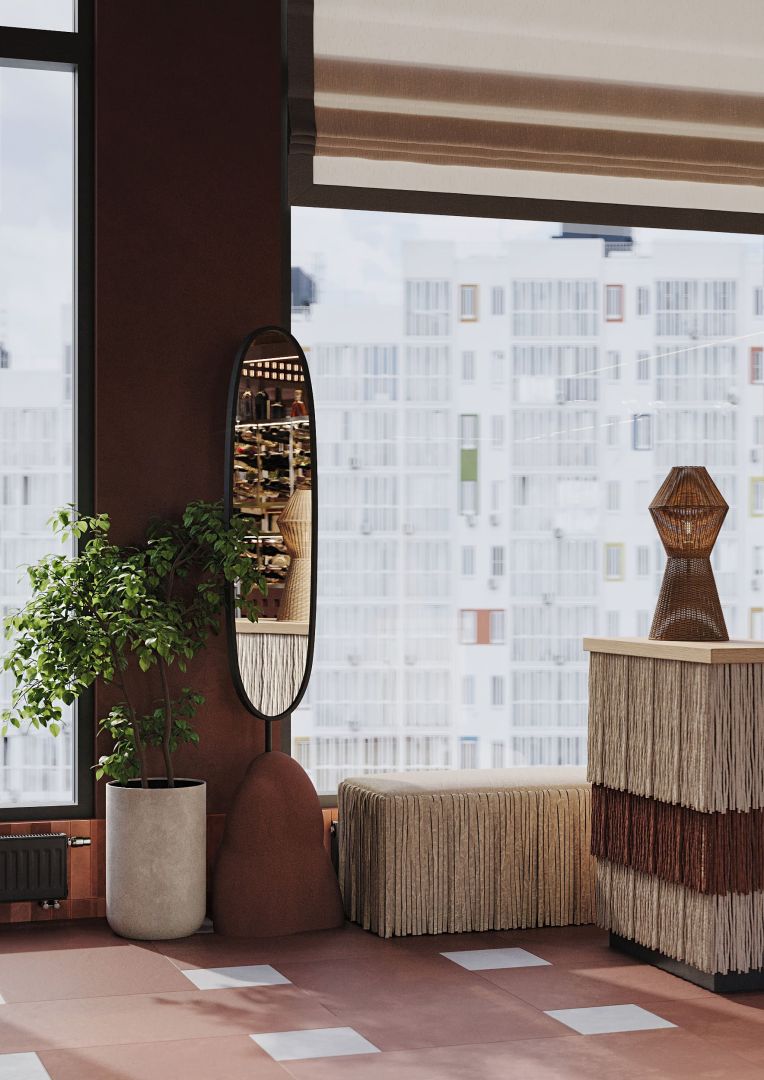 Мы использовали переработанные грузинские мотивы в виде орнаментальных элементах на стенах и мебели. Интересные принты на мягкой мебели, а так же необычные варианты отделок. Было разработано много индивидуальных предметов мебели, интересные стейшны с тканевыми вставками, геометрические формы, столы, декоративные перегородки.