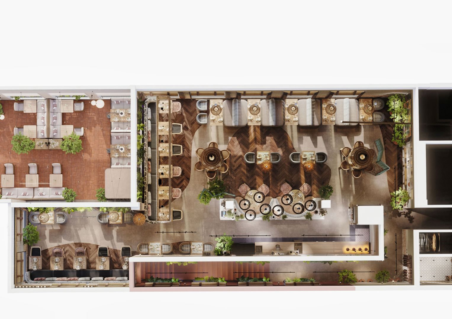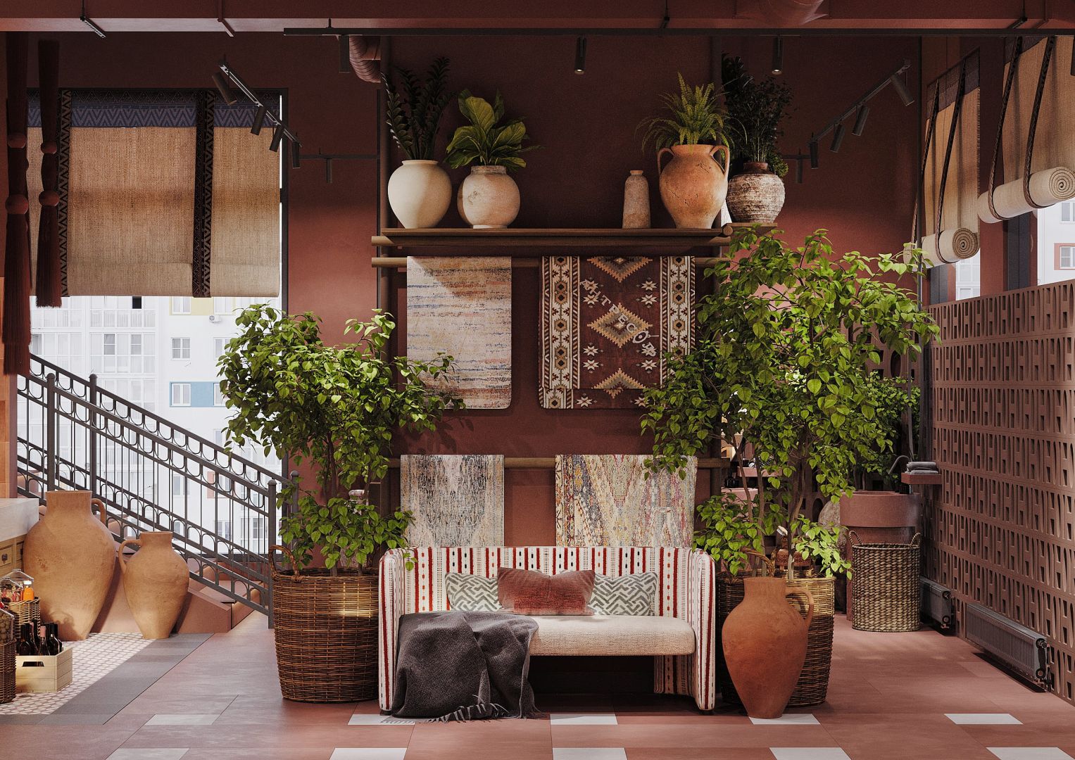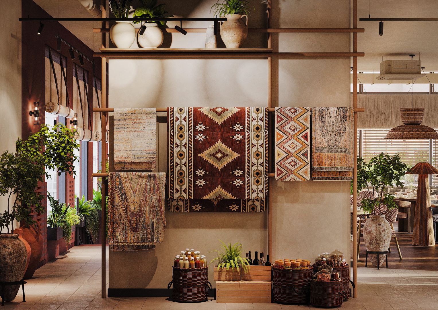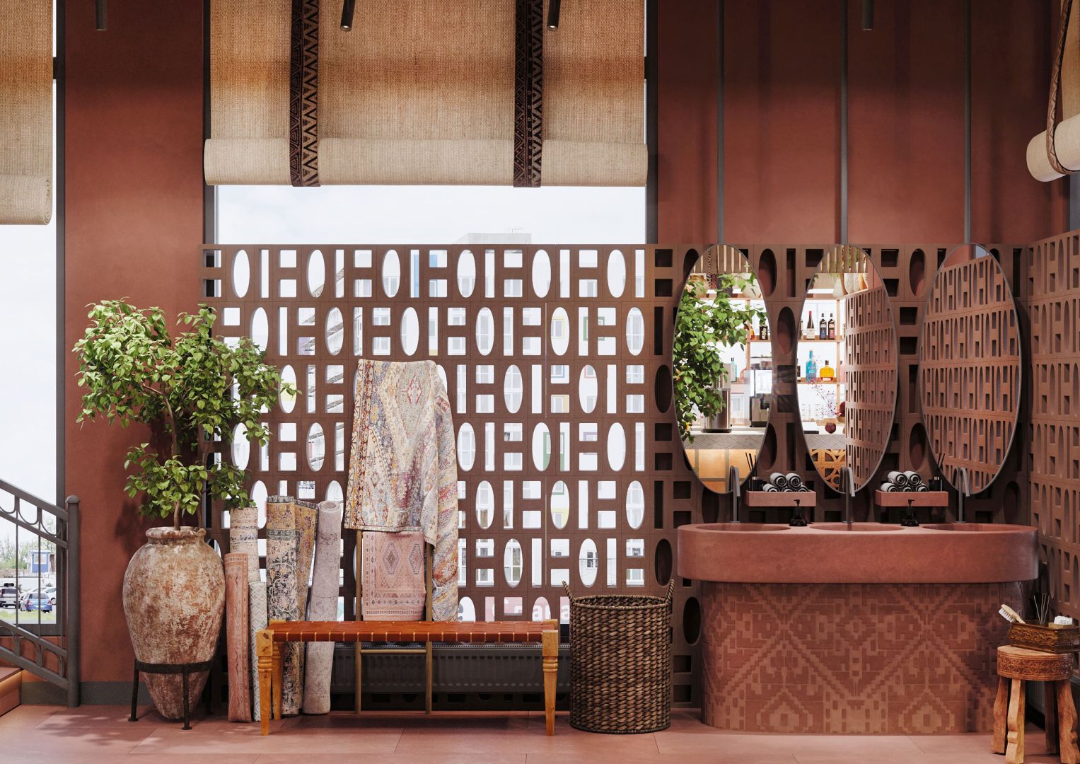 Мы использовали переработанные грузинские мотивы в виде орнаментальных элементах на стенах и мебели. Интересные принты на мягкой мебели, а так же необычные варианты отделок. Было разработано много индивидуальных предметов мебели, интересные стейшны с тканевыми вставками, геометрические формы, столы, декоративные перегородки.