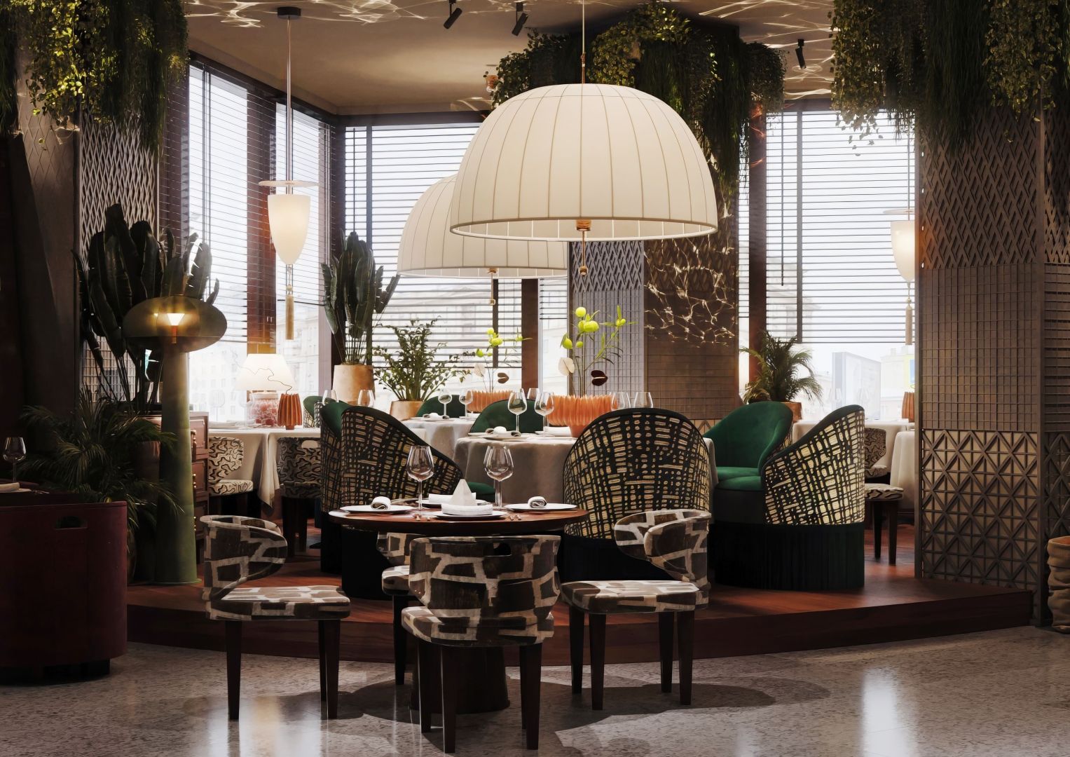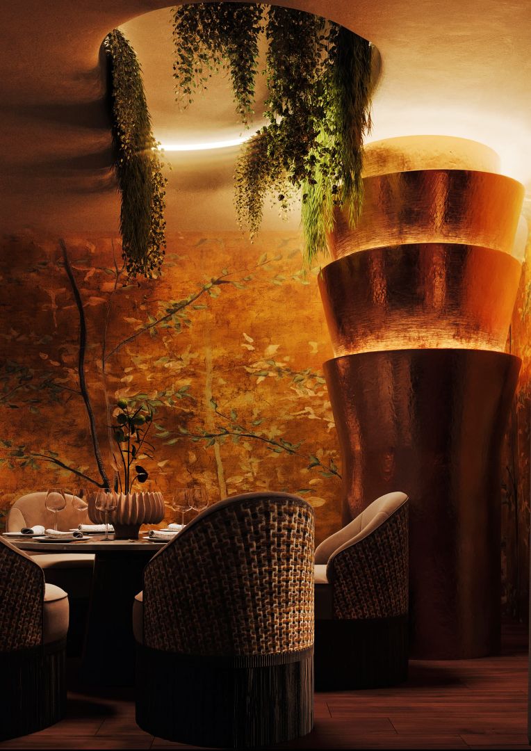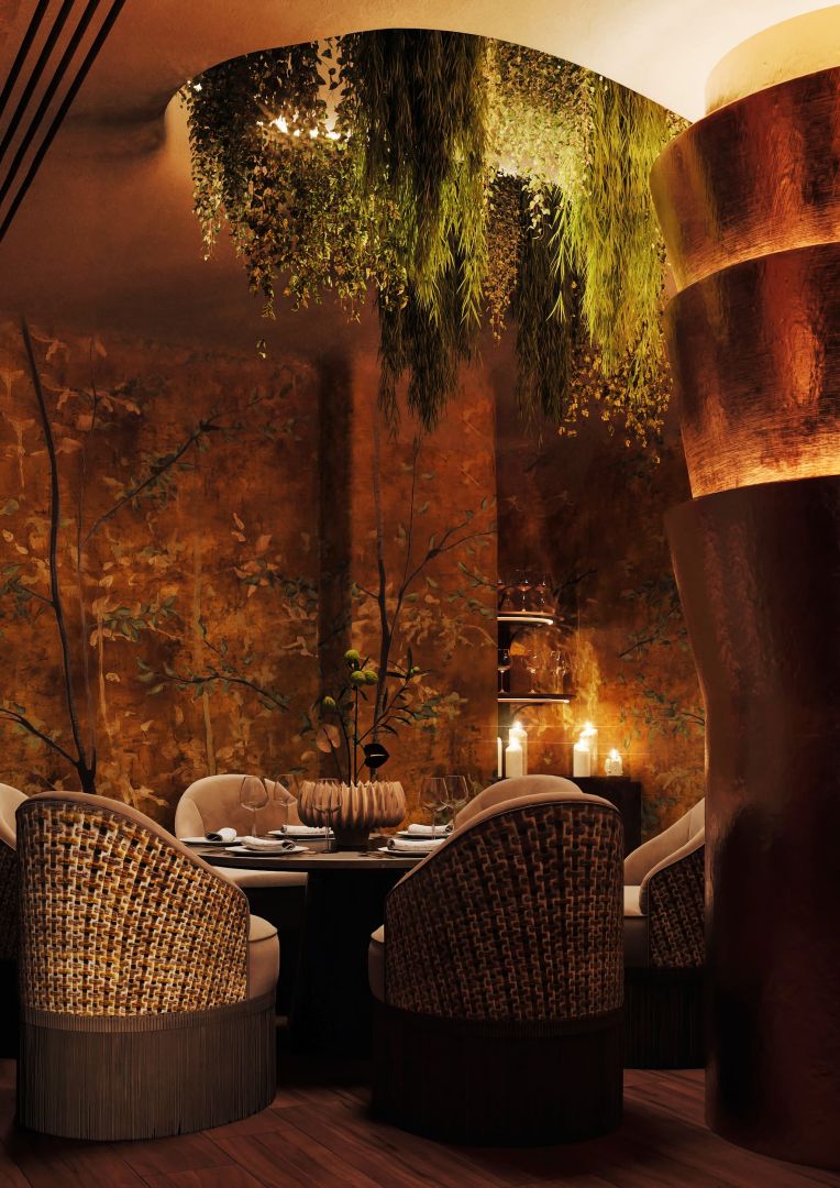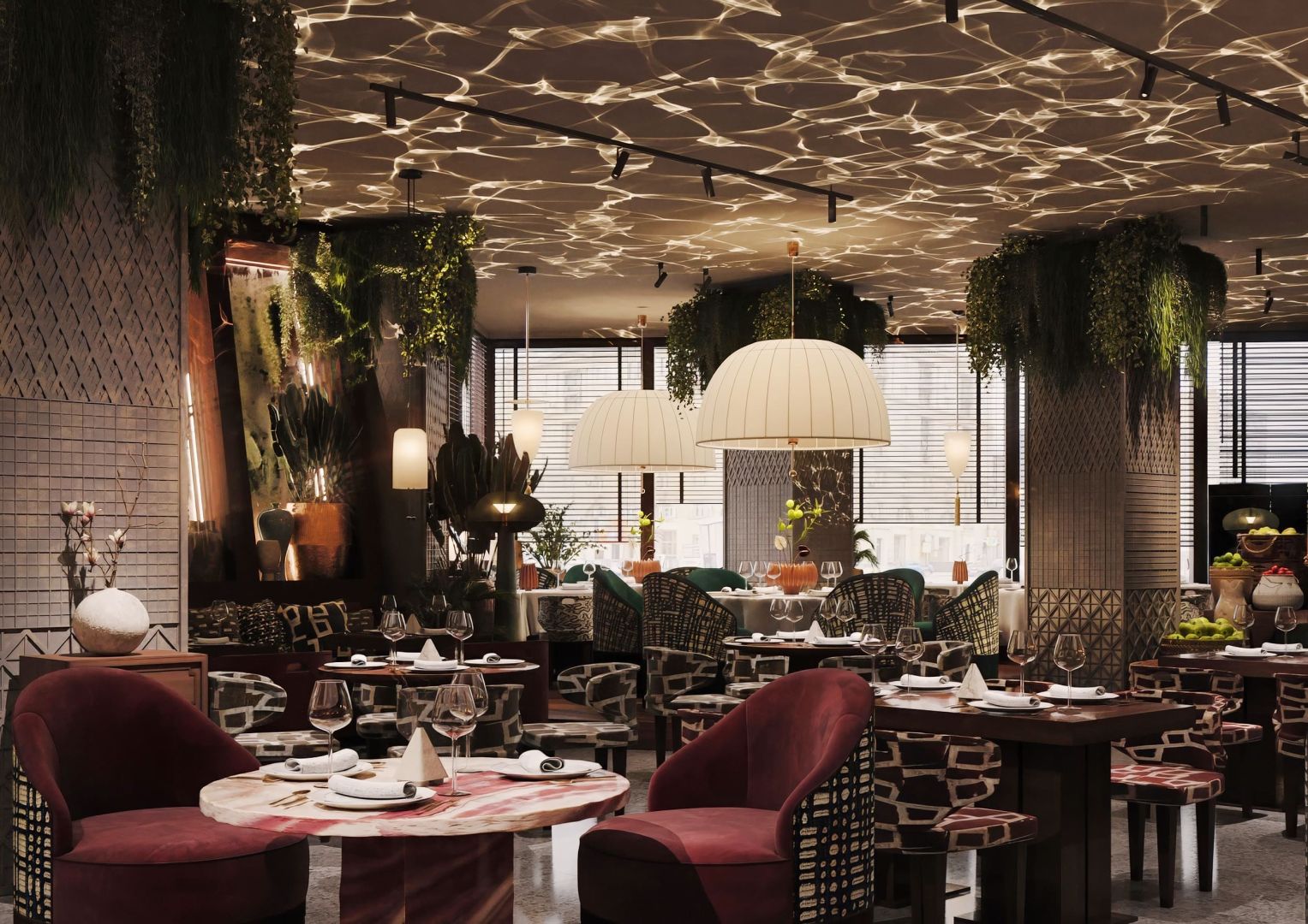 Здесь царит гармония роскоши и природности, искусства и комфорта. Этот ресторан — не просто место для ужина, а полноценный эстетический опыт, где каждый гость становится частью театра дизайна.