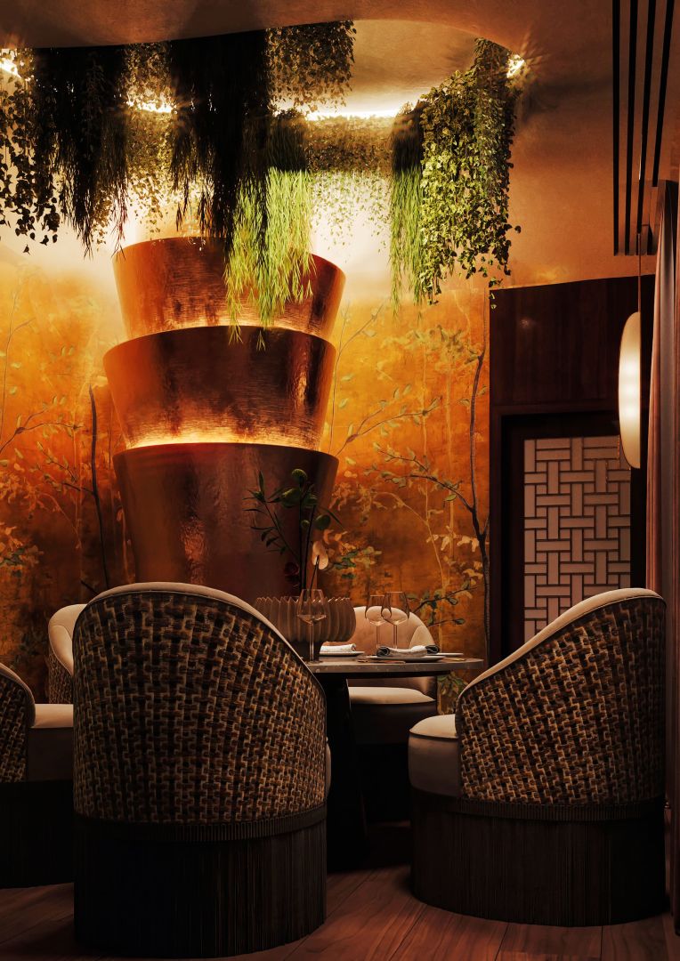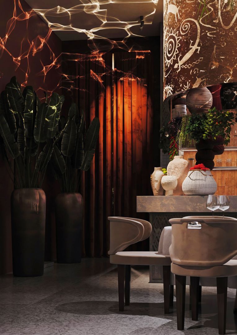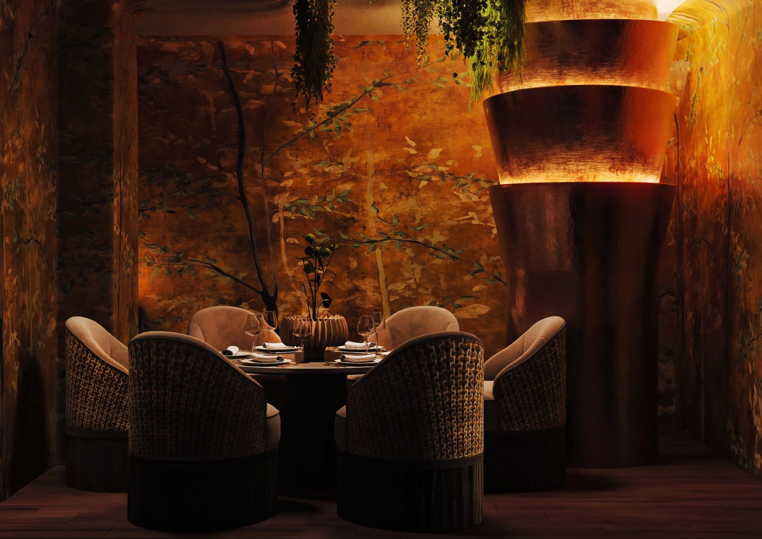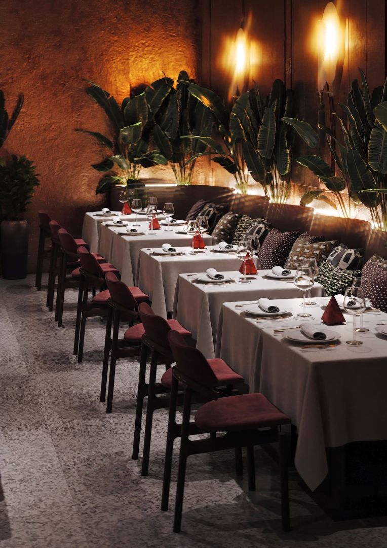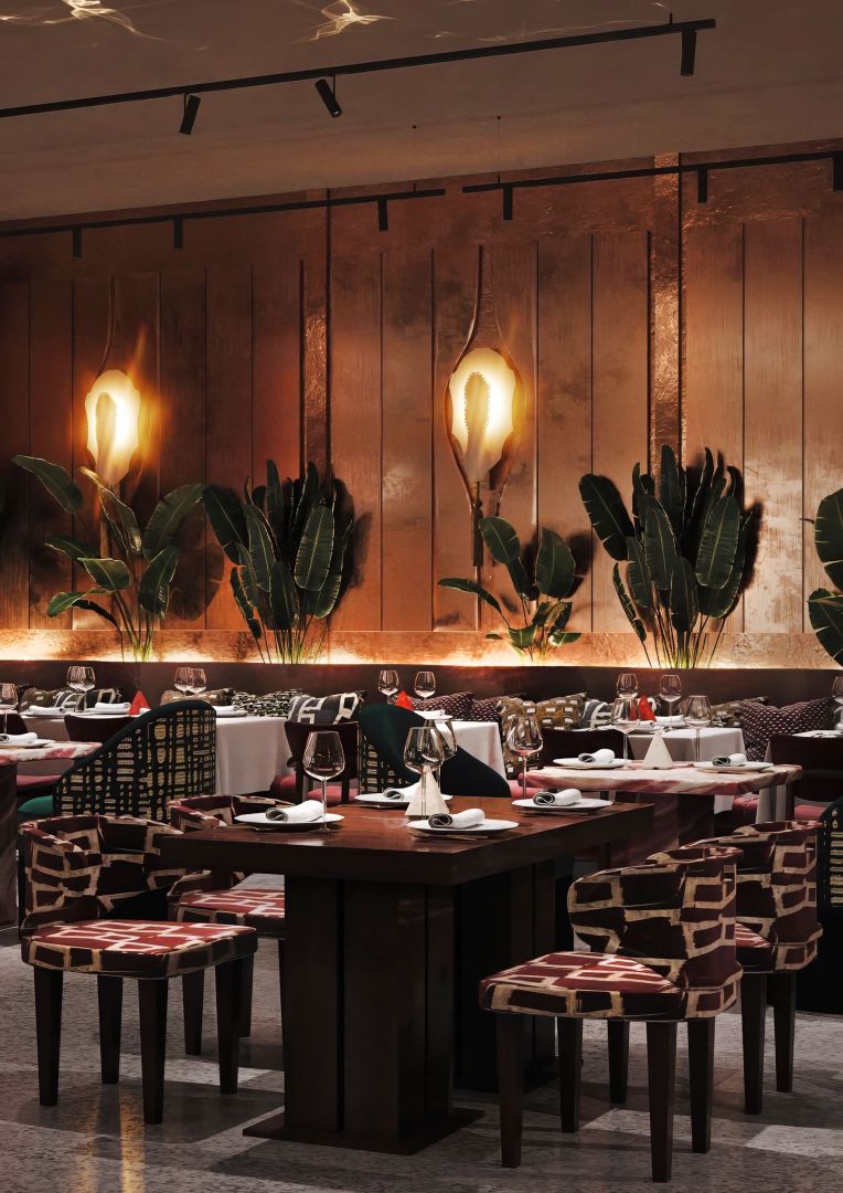 Здесь царит гармония роскоши и природности, искусства и комфорта. Этот ресторан — не просто место для ужина, а полноценный эстетический опыт, где каждый гость становится частью театра дизайна.