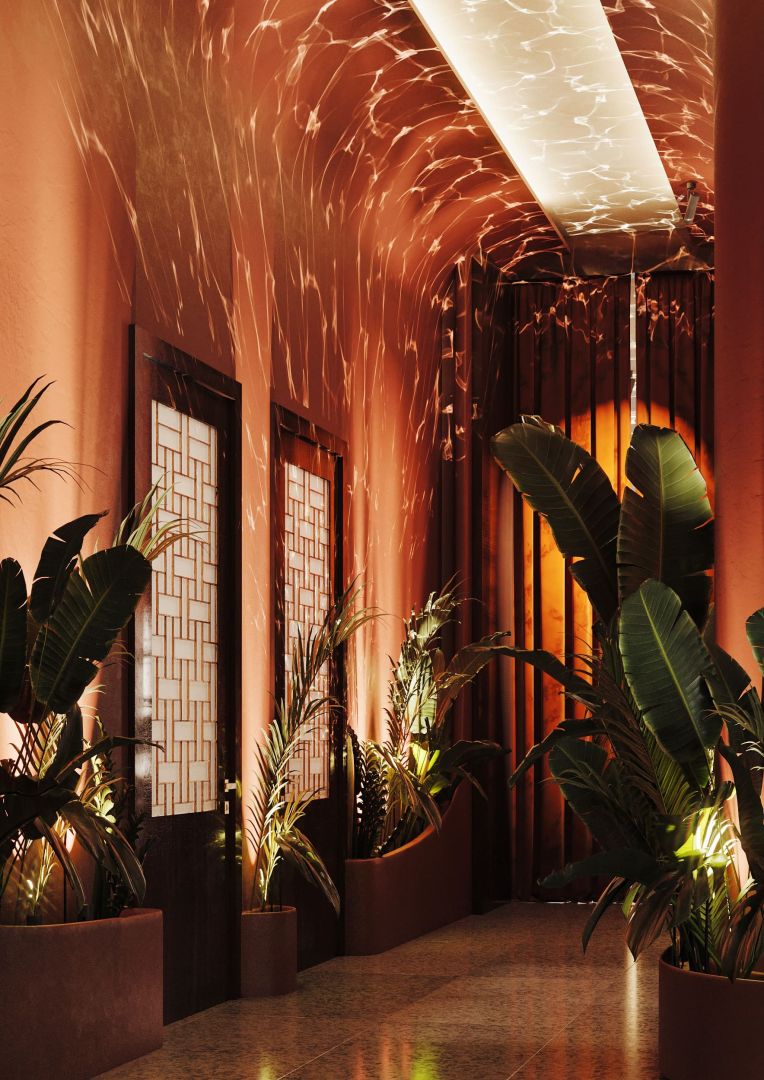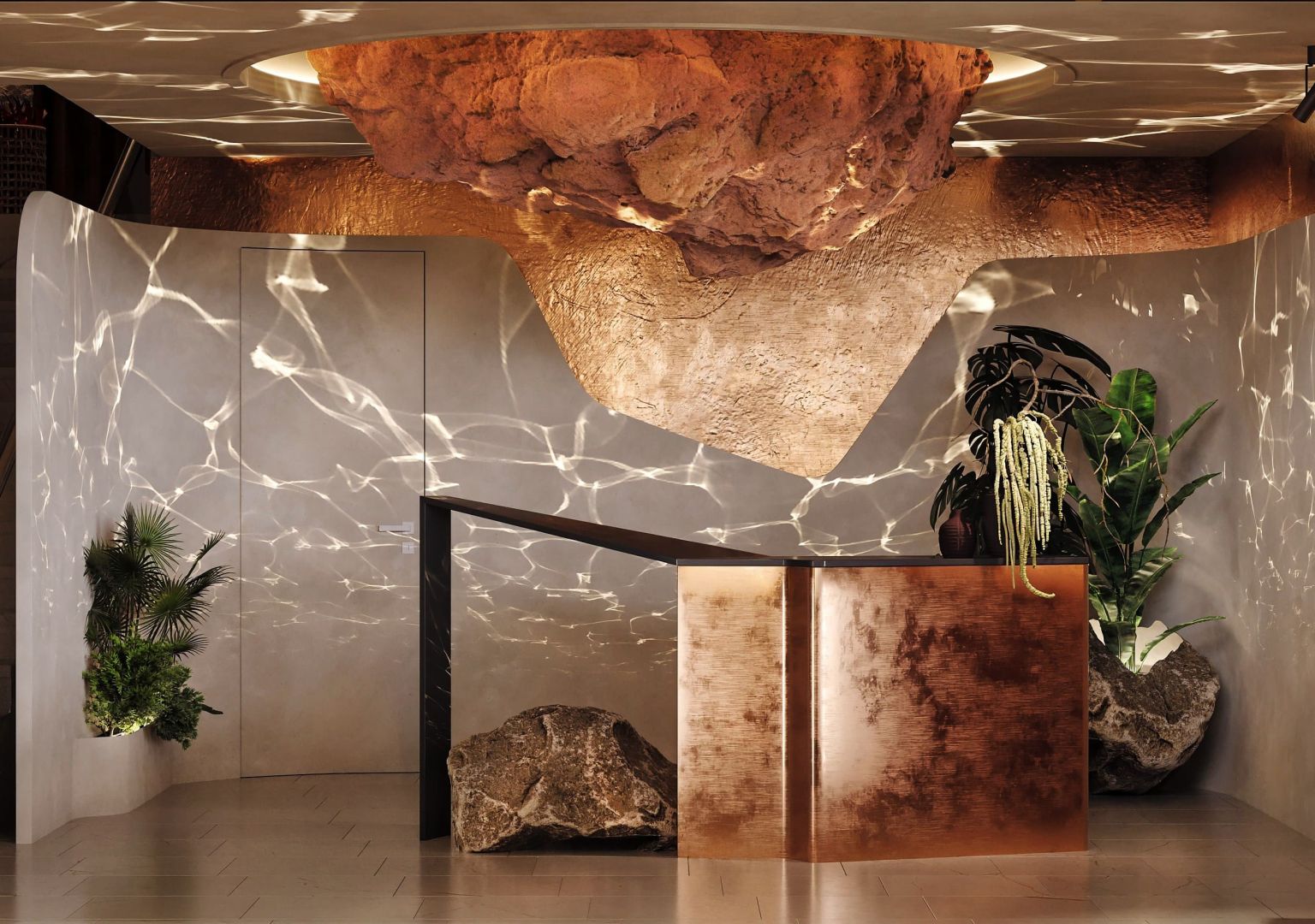 Интерьер выстроен на сочетании природных мотивов и дорогих материалов. Входная зона с каменной композицией и медными вставками сразу задаёт атмосферу эксклюзивности. Световые отражения на стенах и потолке создают эффект водной глади, добавляя мистики и изысканности.