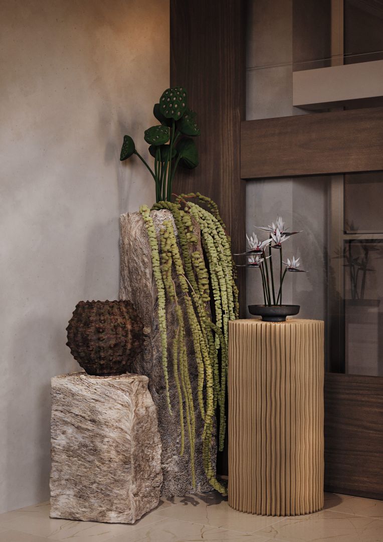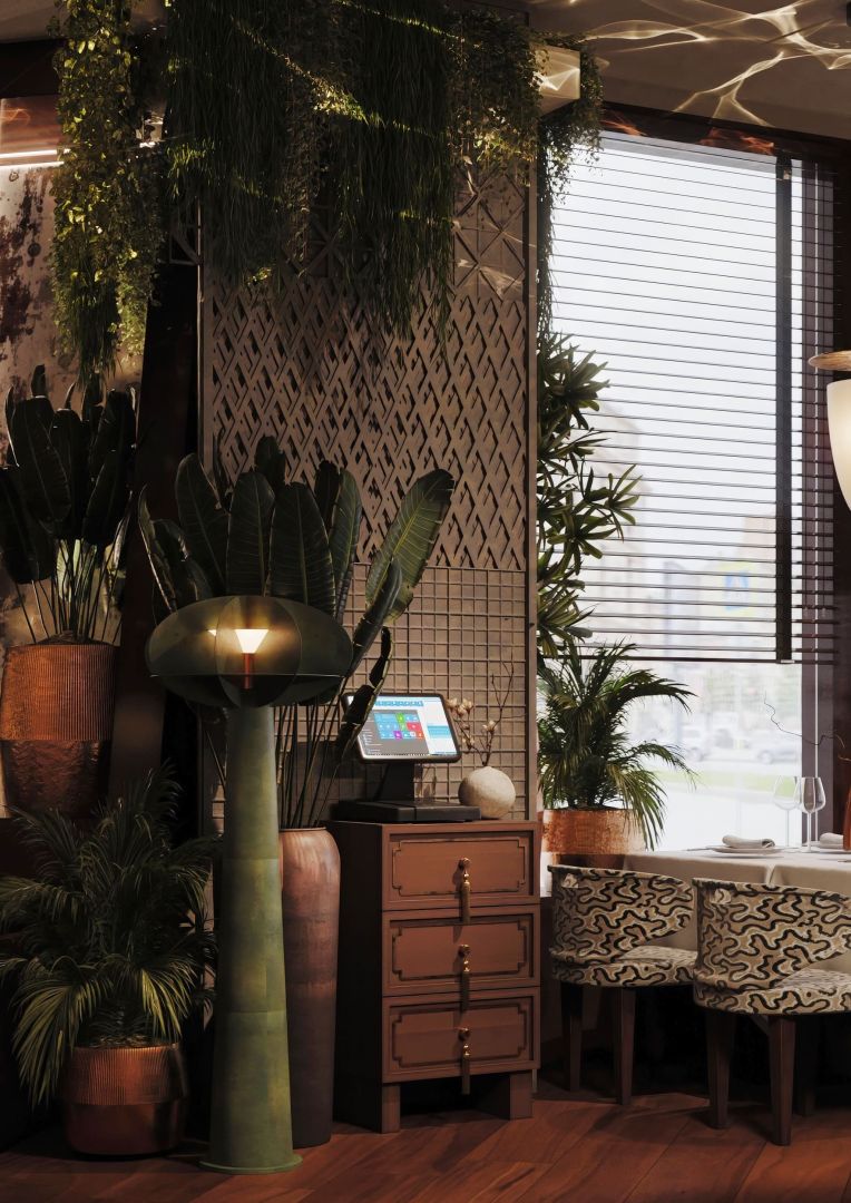 Основное пространство построено вокруг игры фактур: тёплое дерево, камень, металл и текстиль с насыщенными узорами. В интерьере много зелени — подвесные растения, крупные декоративные горшки и живые композиции формируют ощущение природного оазиса в сердце города.