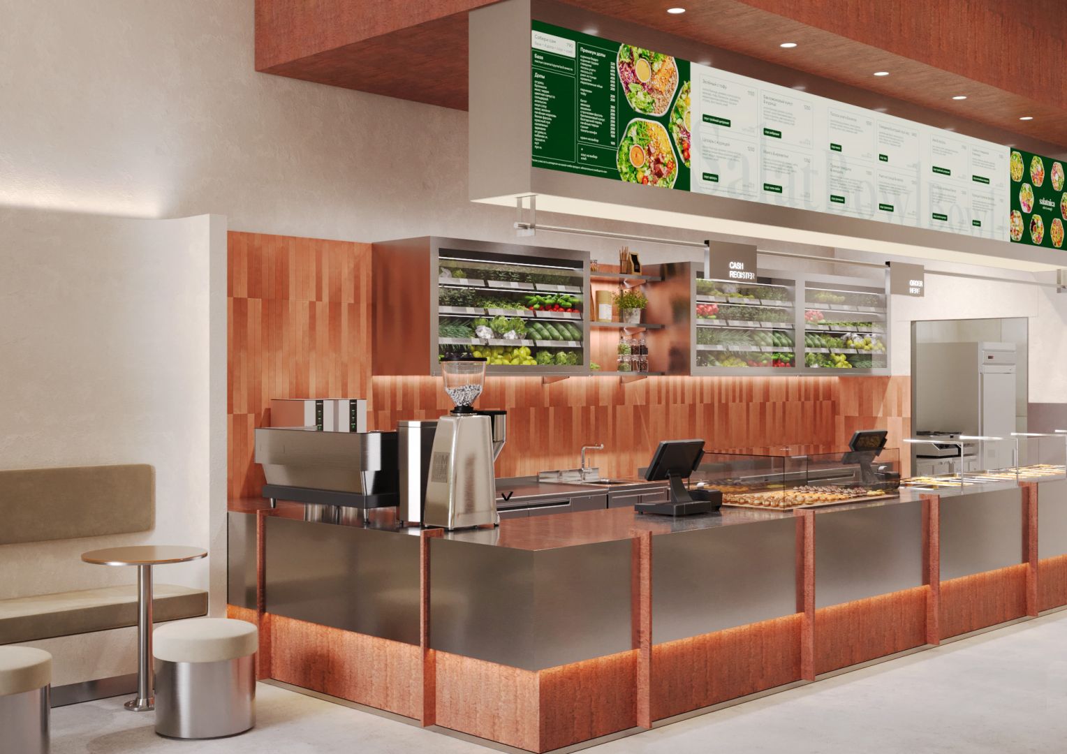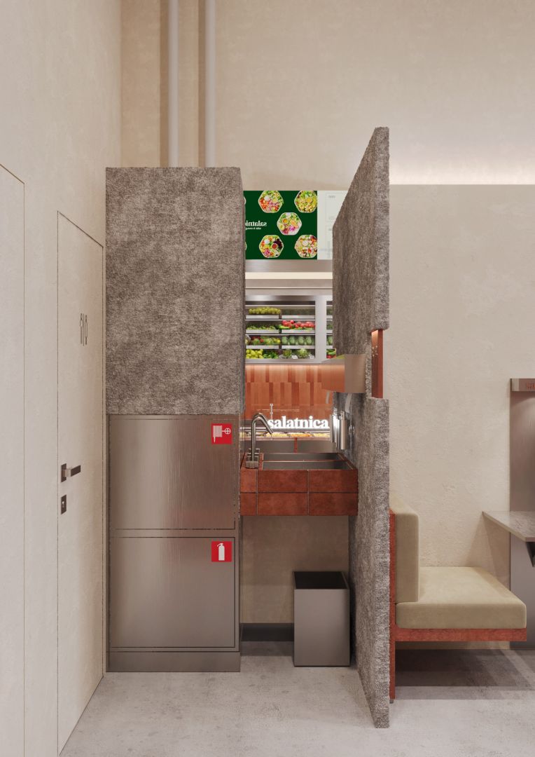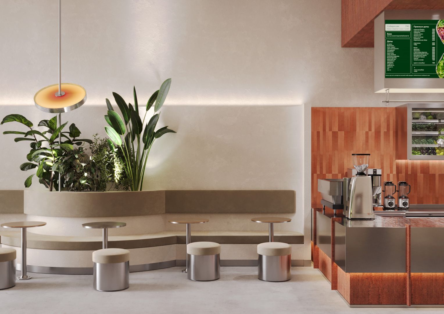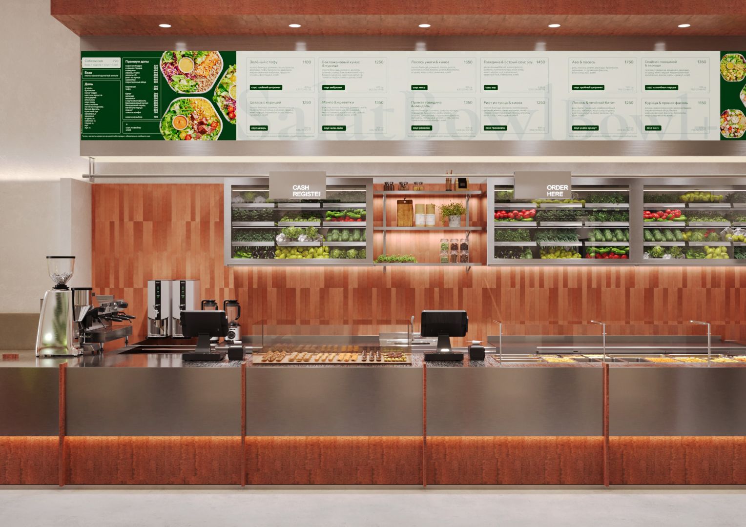 Концепция современного бистро с свежими салатами, боулами и напитками собственного приготовления. Основа концепции это минимализм, чистота форм и линий с яркими акцентами, что прекрасно отражает идеологию создателей этого проекта. Нами были разработаны островные зоны из нержавеющей стали для размещения самого важного — продукта, чтобы ничего не отвлекало внимание от главного. Использовали ее как символ чистоты и простоты составов блюд. Кирпич и дерево смягчили концепцию и добавили уюта.