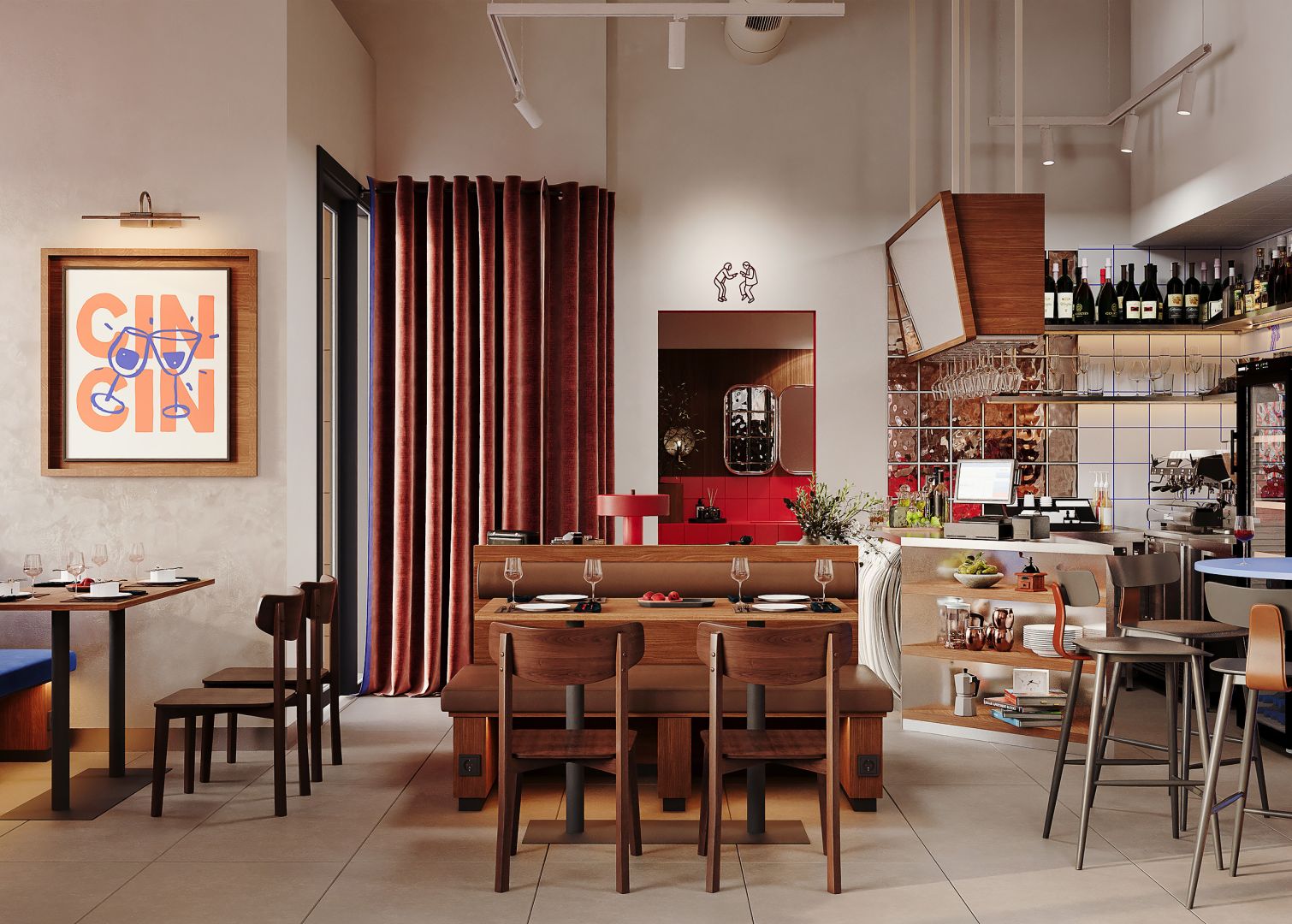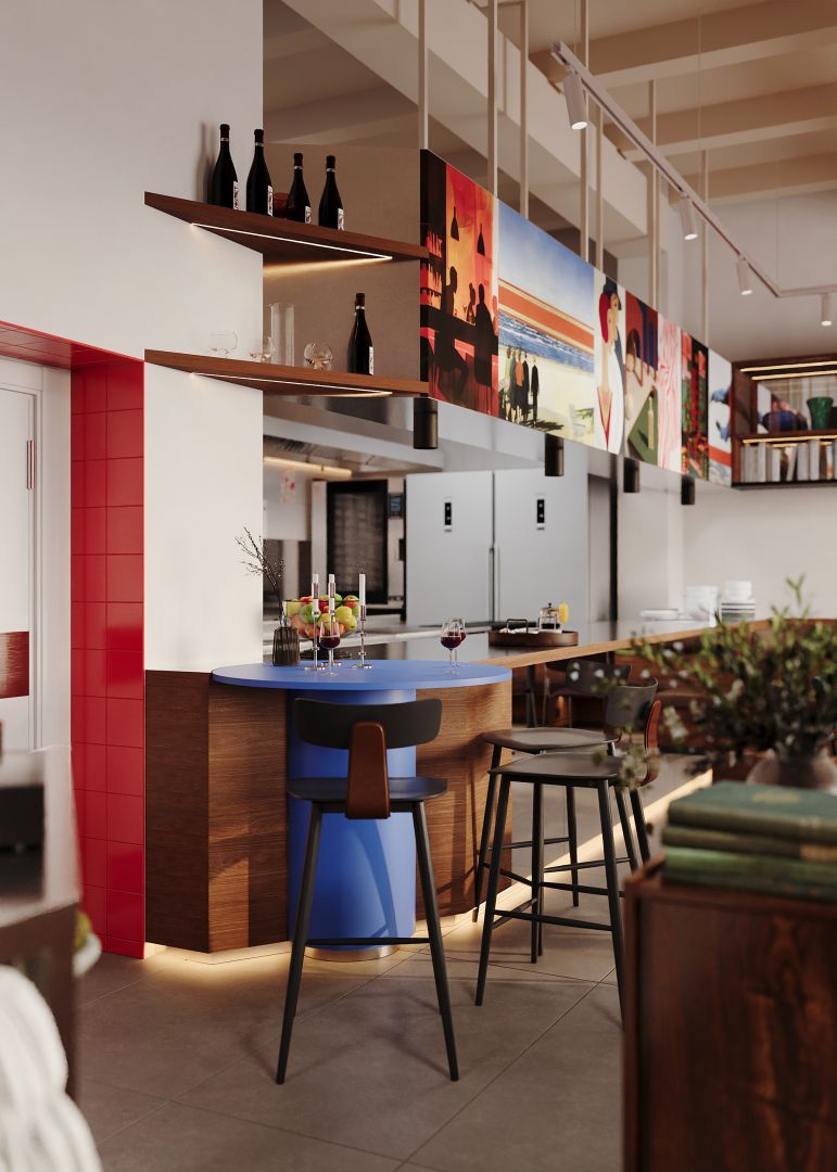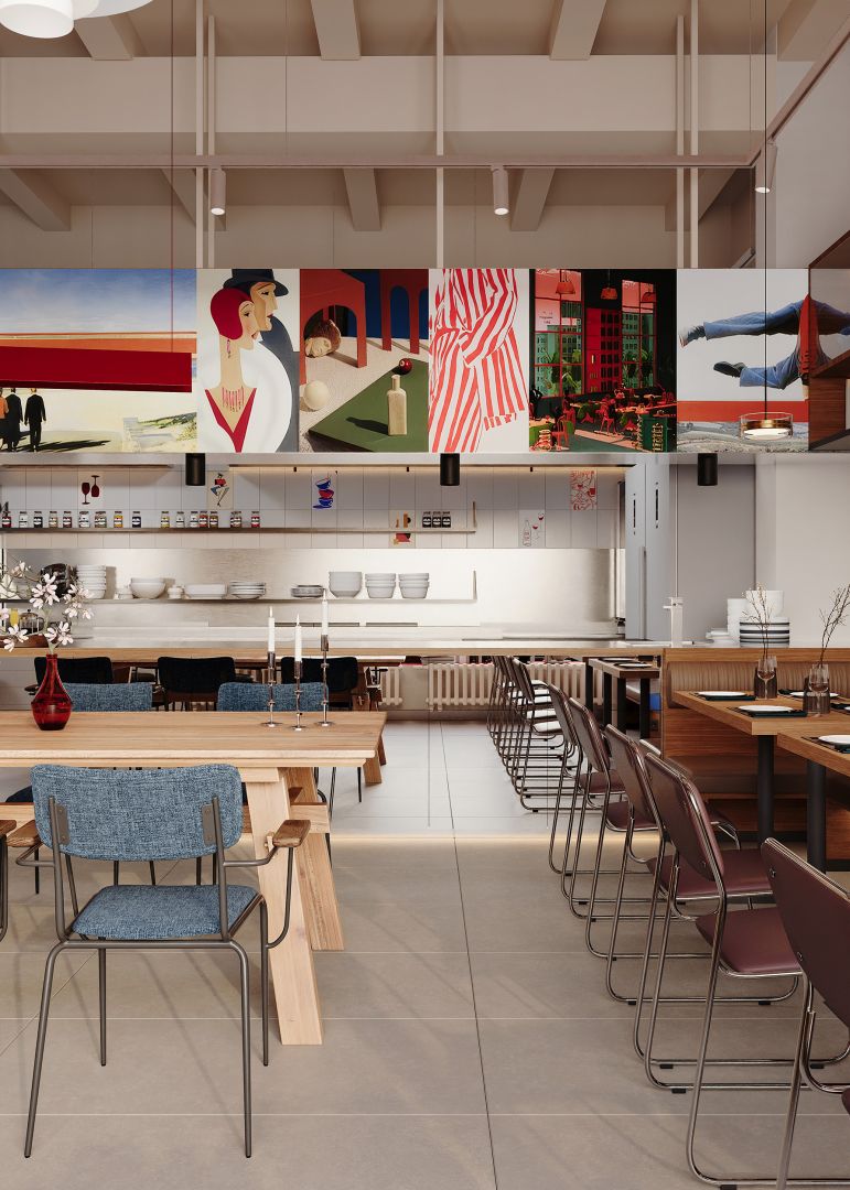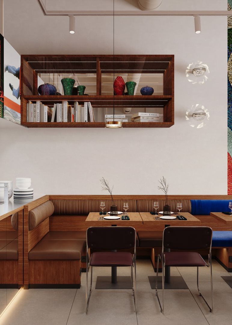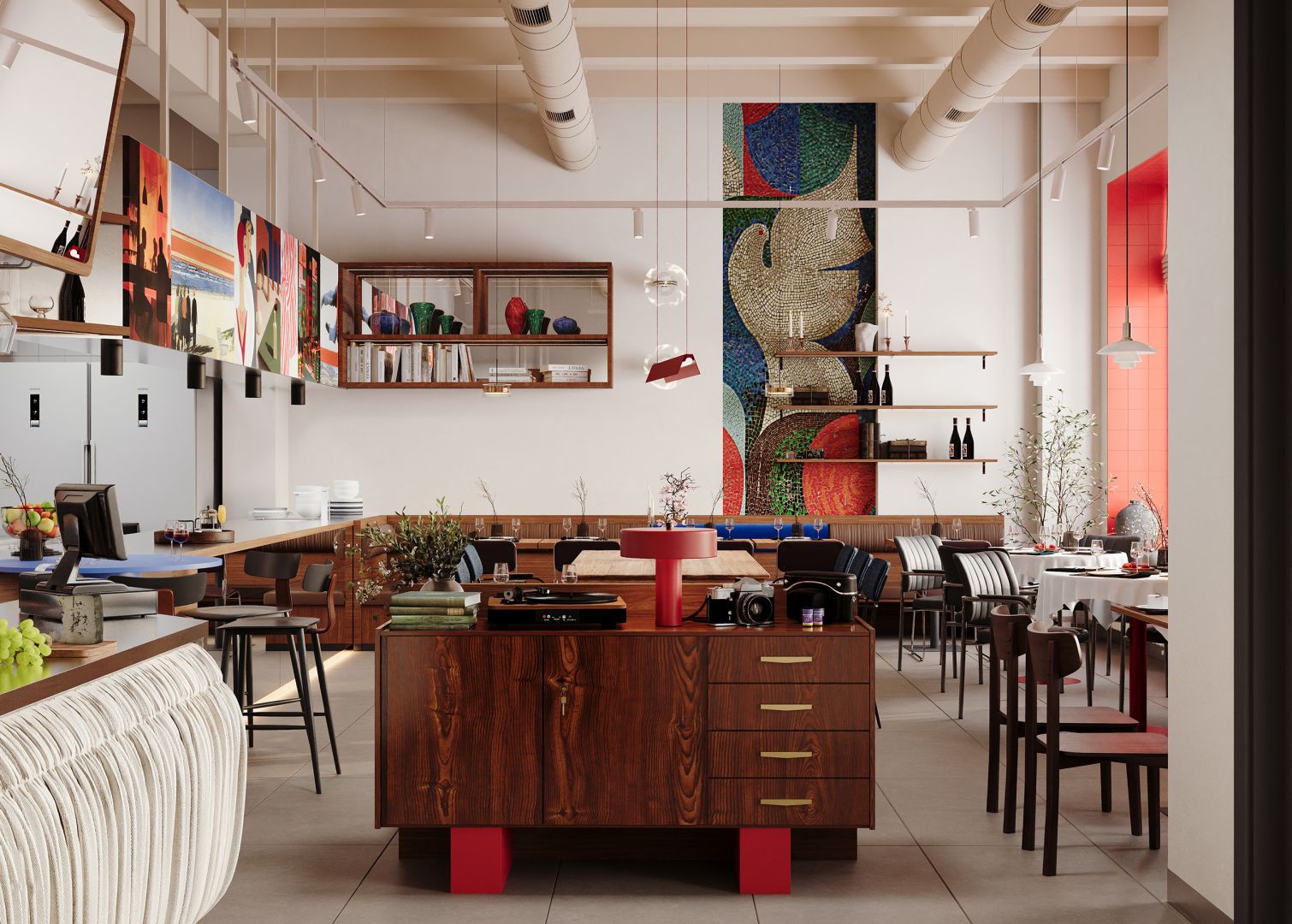Гастрономическое бистро SMENA c ярким и стильным интерьером, сочетающим элементы современного дизайна с яркими акцентами и ретро арт-объектами. В пространстве присутствуют мягкие и удобные диваны, разноформатными стулья с интересными текстурами. Один из ключевых элементов – мозаичное панно, которое украшает стену и добавляет цветовых акцентов. Витрины с винами и другими напитками удачно вписываются в пространство и создают расслабленную атмосферу. Просторная и открытая кухня с видом на столы, а также картины и художественные элементы на стенах насыщают пространство творчеством и вдохновением.