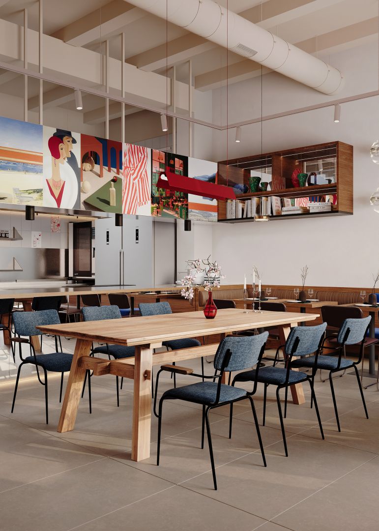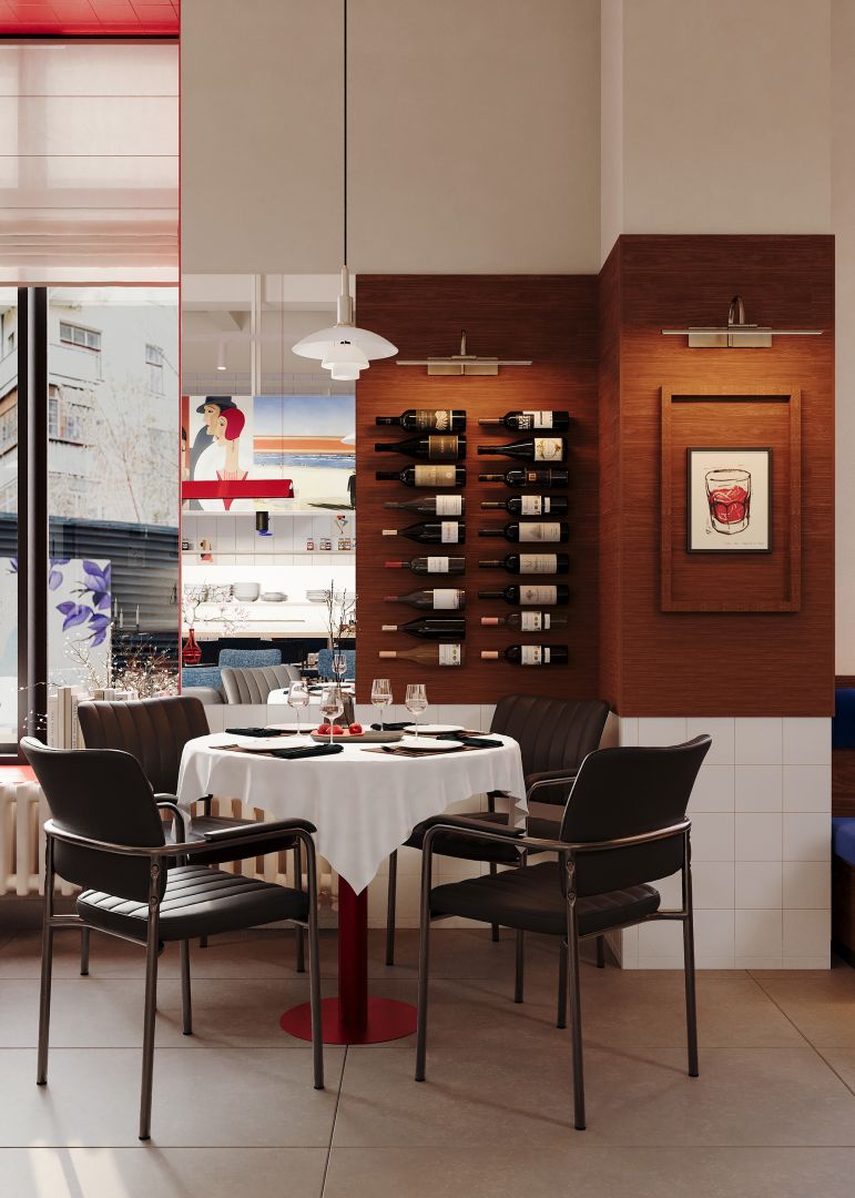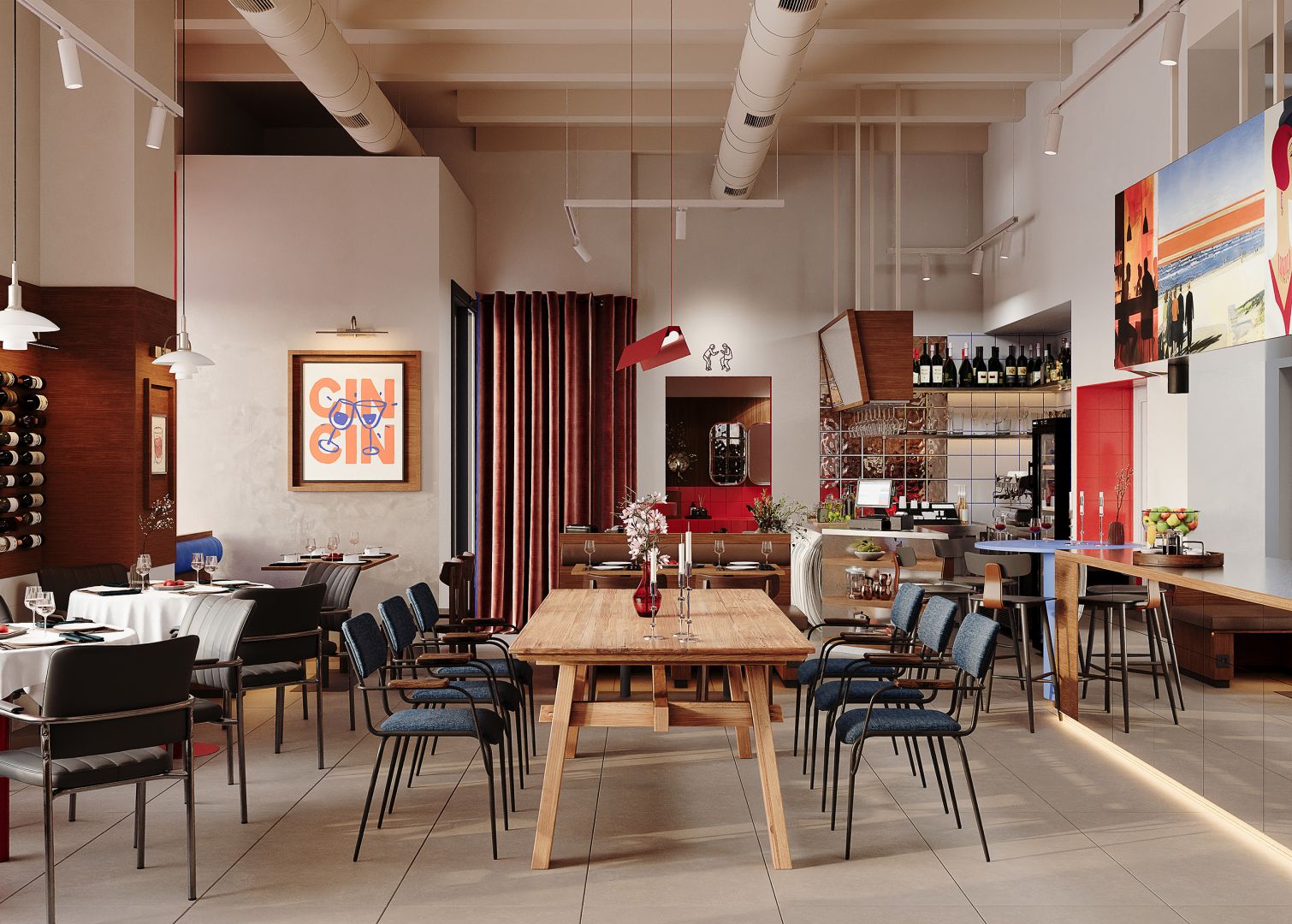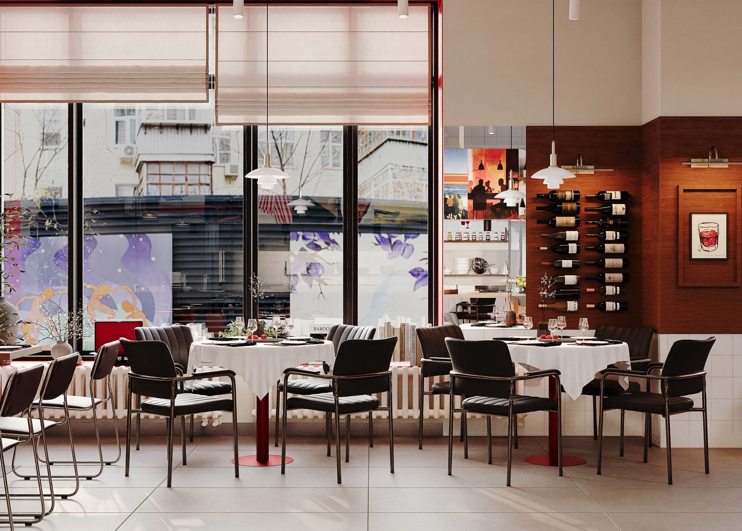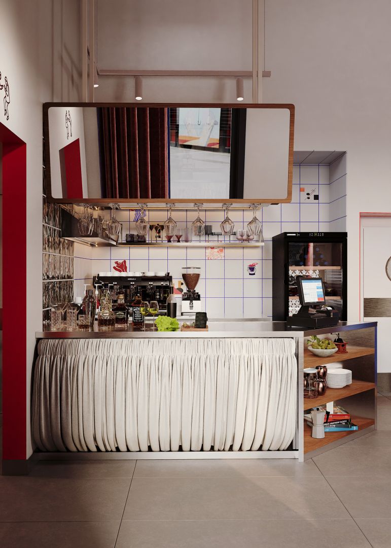 Гастрономическое бистро SMENA c ярким и стильным интерьером, сочетающим элементы современного дизайна с яркими акцентами и ретро арт-объектами. В пространстве присутствуют мягкие и удобные диваны, разноформатными стулья с интересными текстурами. Один из ключевых элементов – мозаичное панно, которое украшает стену и добавляет цветовых акцентов. Витрины с винами и другими напитками удачно вписываются в пространство и создают расслабленную атмосферу. Просторная и открытая кухня с видом на столы, а также картины и художественные элементы на стенах насыщают пространство творчеством и вдохновением.